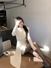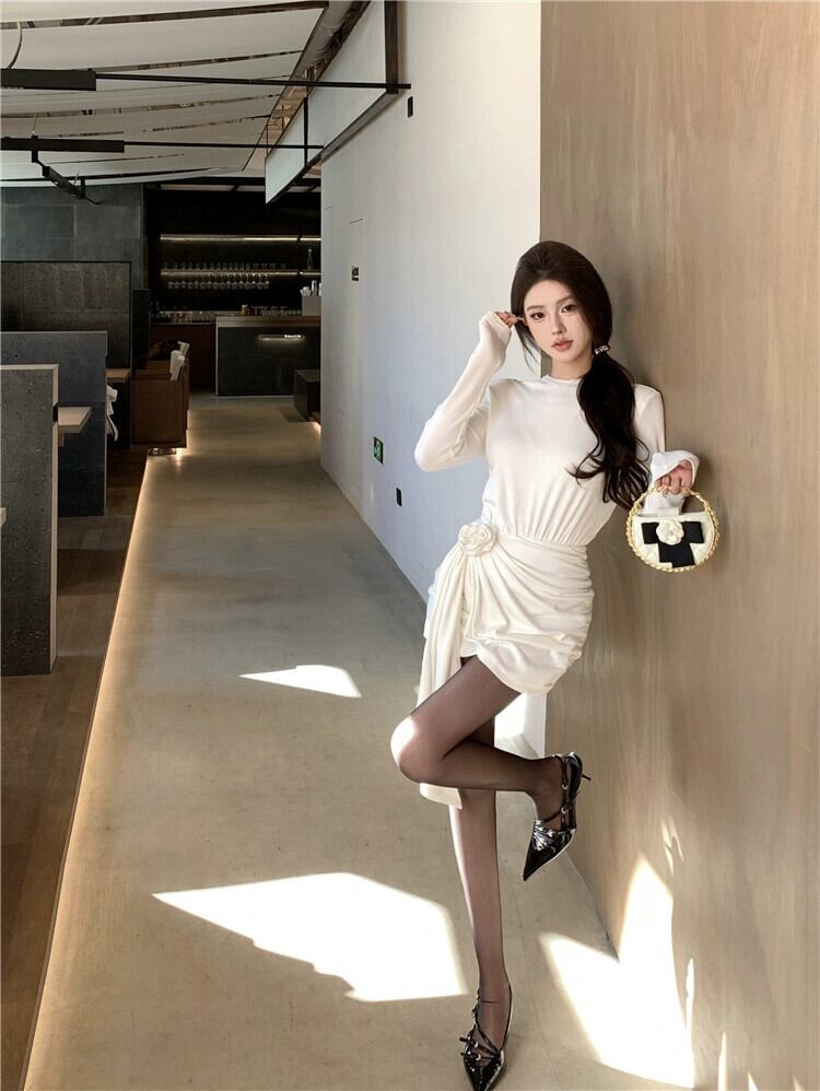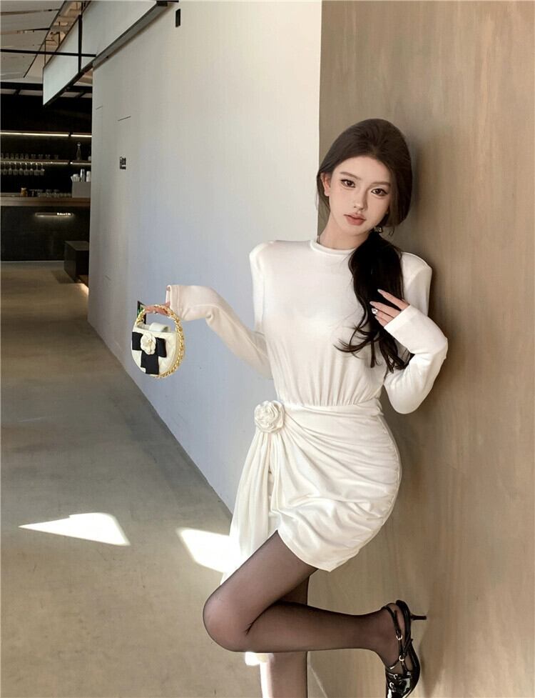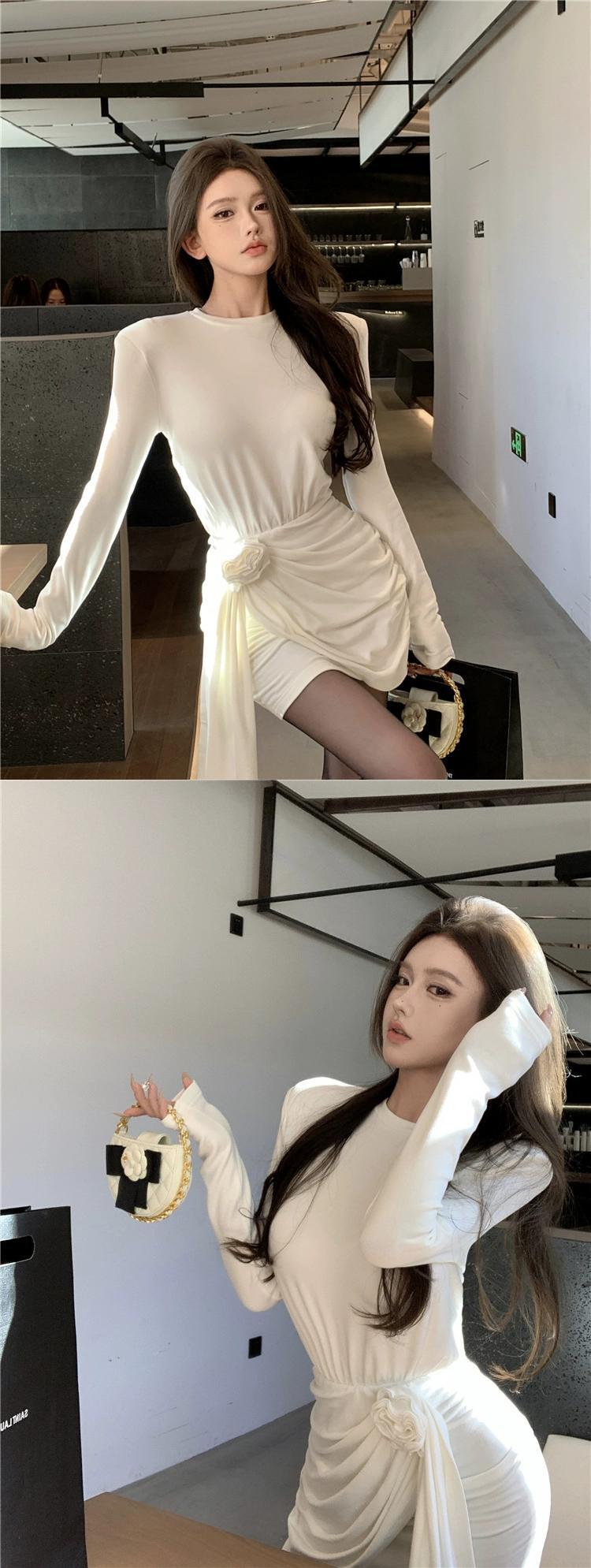 ED プリーツラウンドネック長袖ドレス女性 2024 春の新しい不規則なスリムスリムショートスカート ロング スプリング 春物 Oネック 0921956236081071