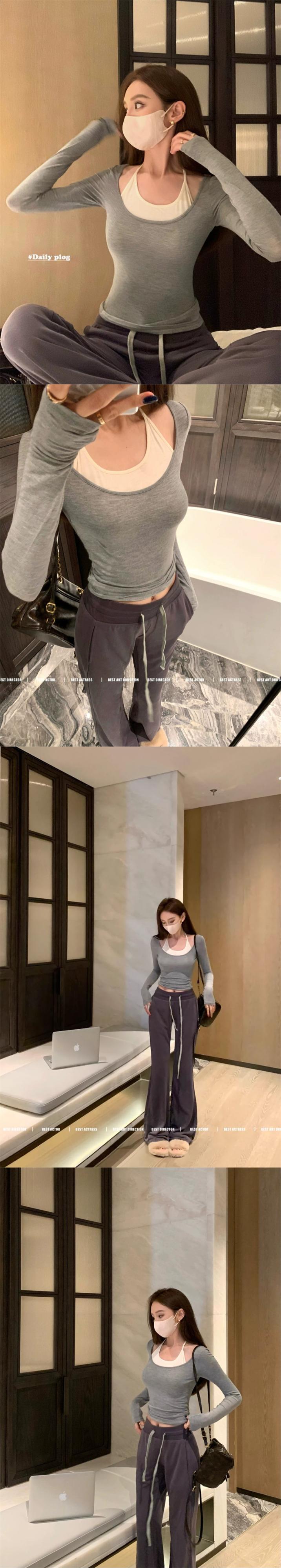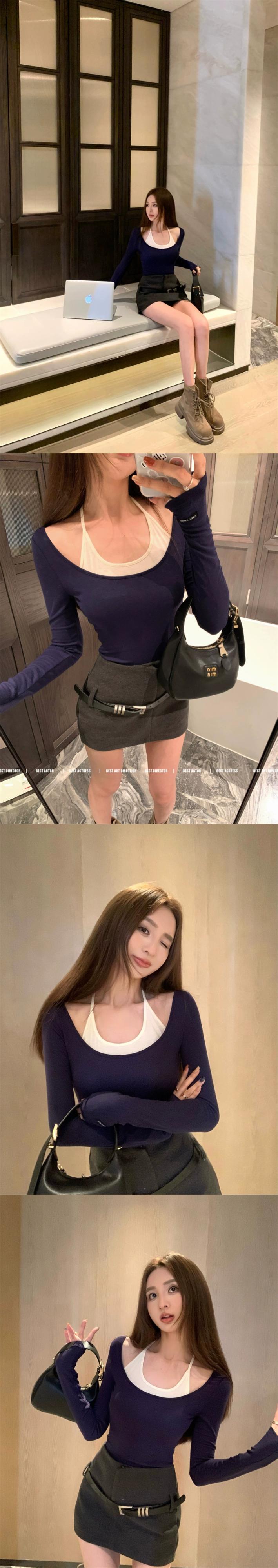 アメリカの対照的なカラー偽ツーピースホルターネック Tシャツ女性 2024 春の新しいセクシーなタイトなショート長袖トップ ロング スプリング 春物 0921948003963555