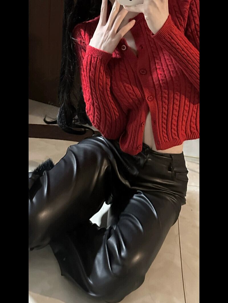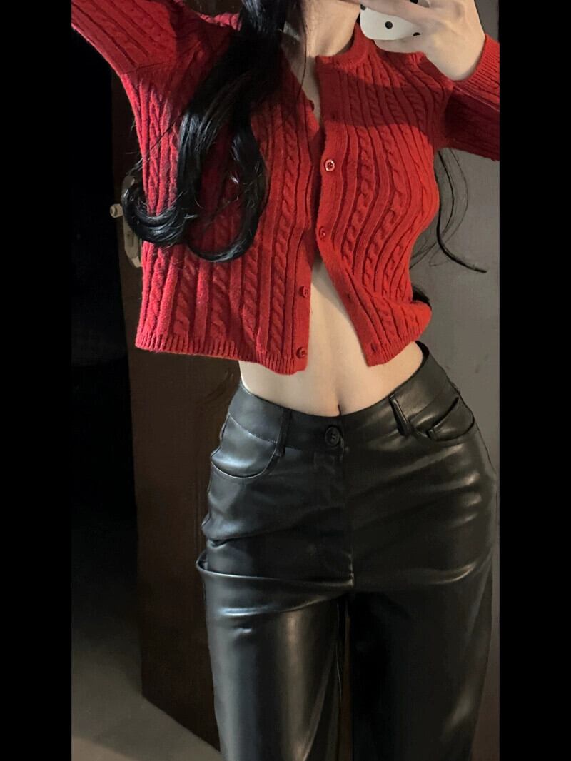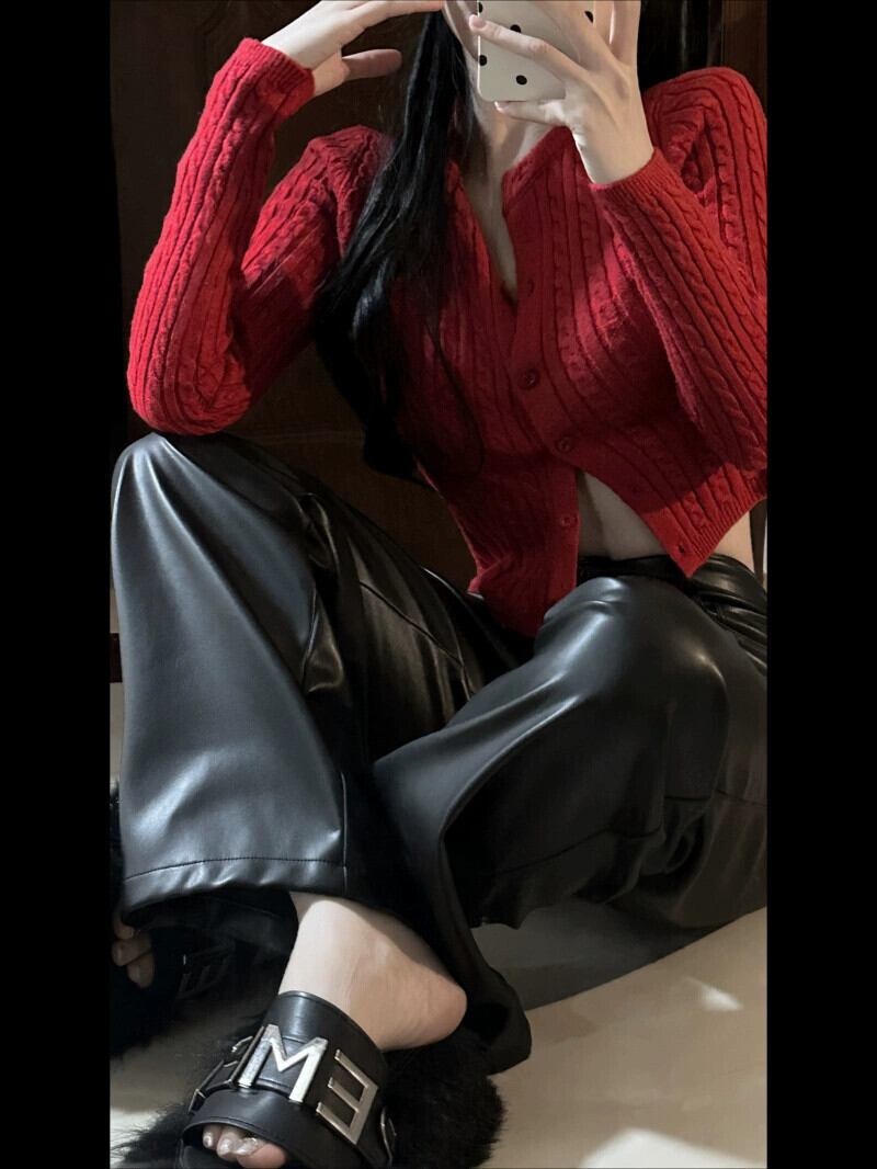 色:赤いニットセーター,ウエストブラックレザーパンツ