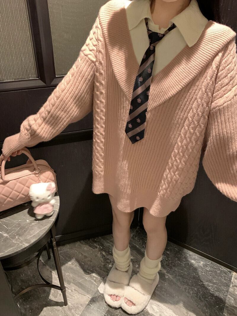 スタイルフェイクツーピースプルオーバー長袖セーター女性春 2024 新スタイルミッドレングスルーズ痩身ニットトップ ロング スプリング 春物 0921911186719756