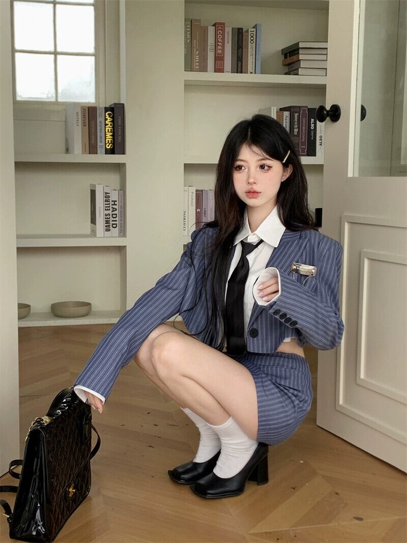 塩カレッジスタイルスーツ女性 2024 春の新ショートベストスーツジャケット痩身スカート 3 点セット スプリング 春物 0921948289867719