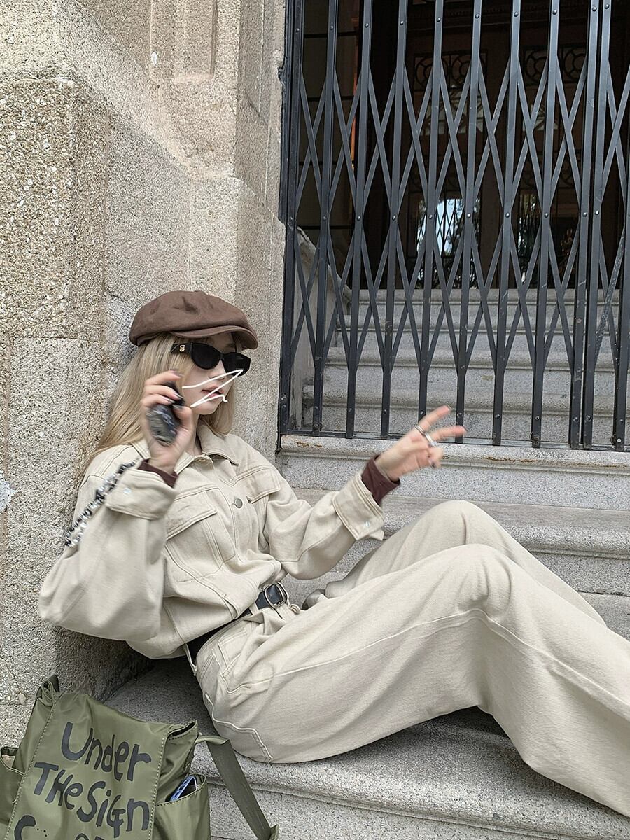 レトロファッションカジュアルスーツ女性 2024 春の新ジャケットデニムジャケットトップワイドレッグパンツ 2 点セット スプリング 春物 ワイドパンツ 0921970444026251