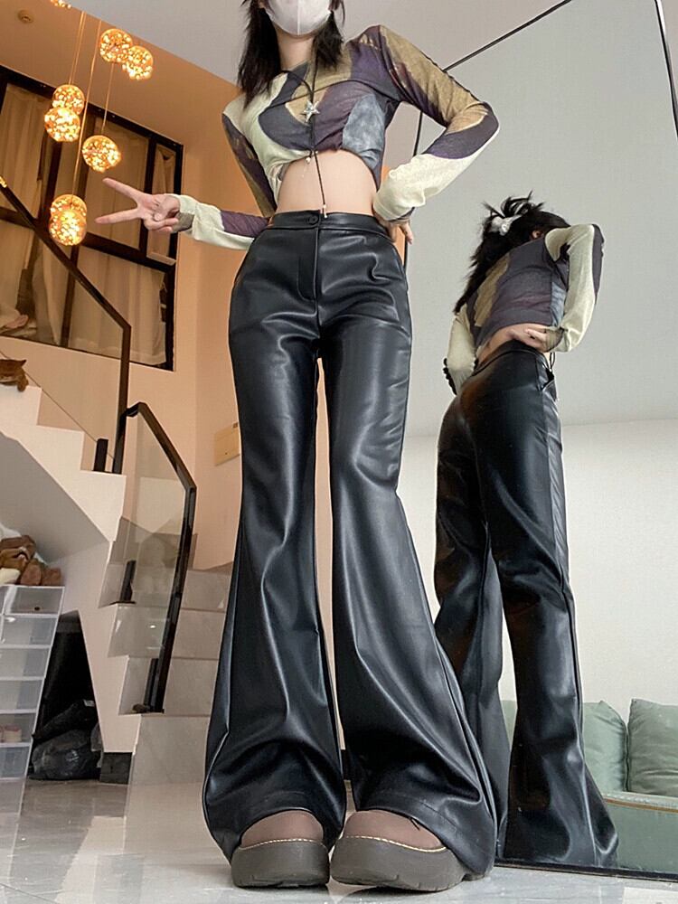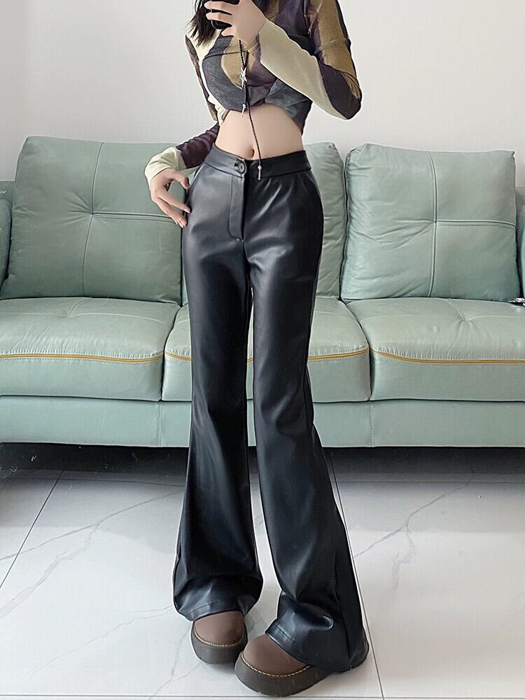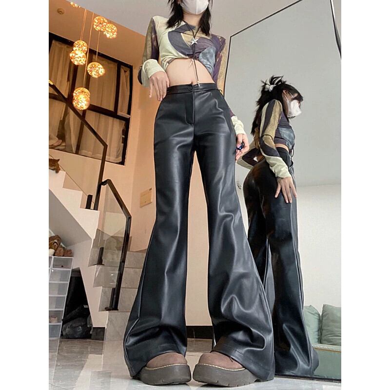 バージョンのレトロスリムフィットマイクロフレアカジュアルパンツ女性春 2024 新しいスリムハイウエスト pu レザーファッショナブルなフロアレングスパンツ スプリング 春物 0921951505932219
