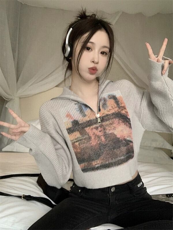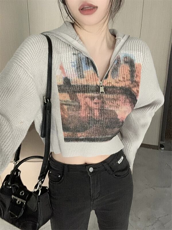 ed ジッパー V ネック長袖セーター女性春 2024 新しいアメリカンプリントショートショルダートップトレンディな ロング スプリング 春物 Vネック 0921993727231404
