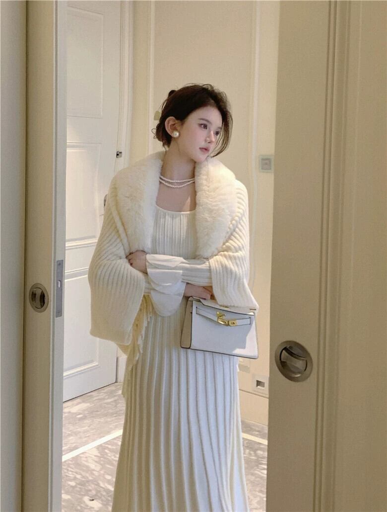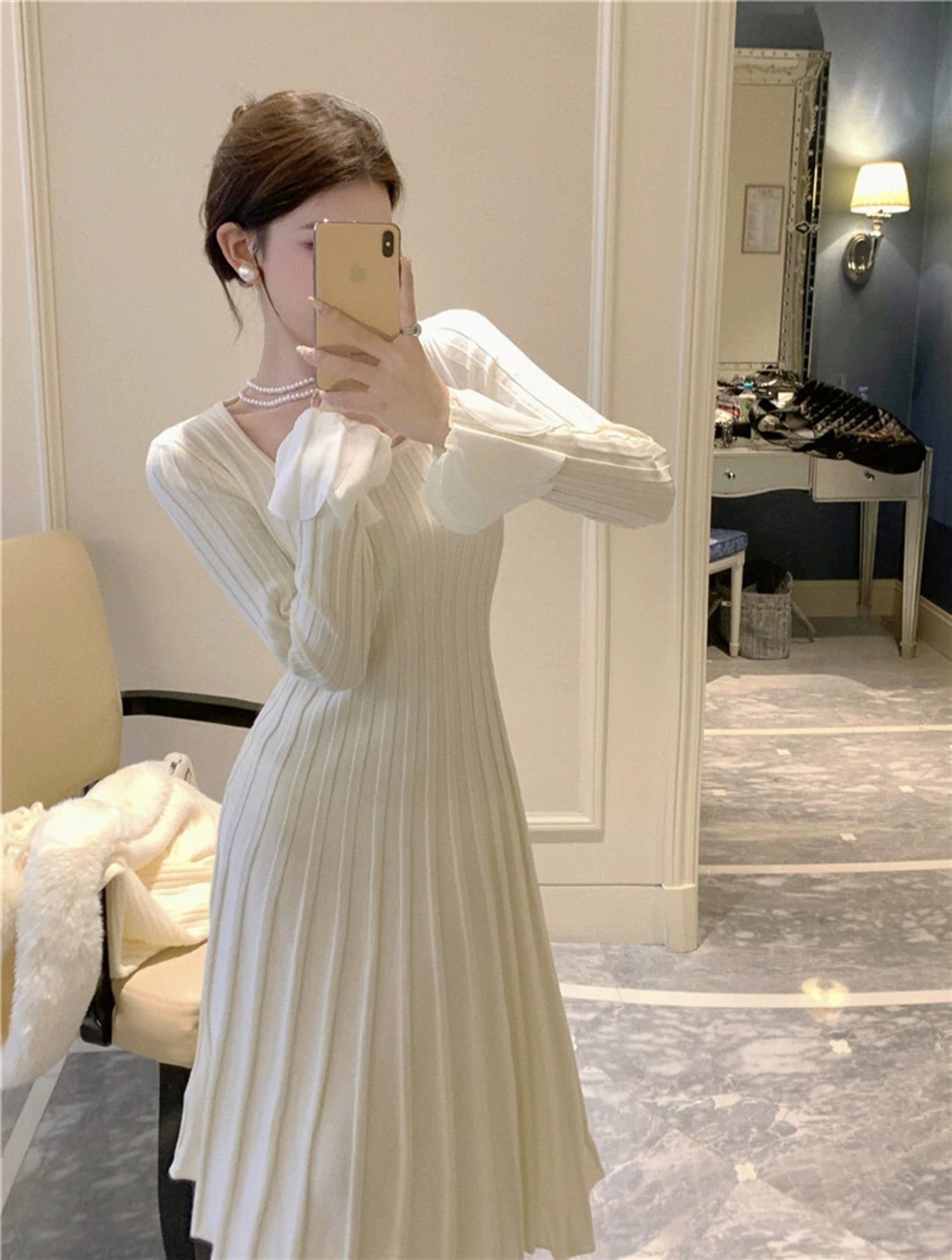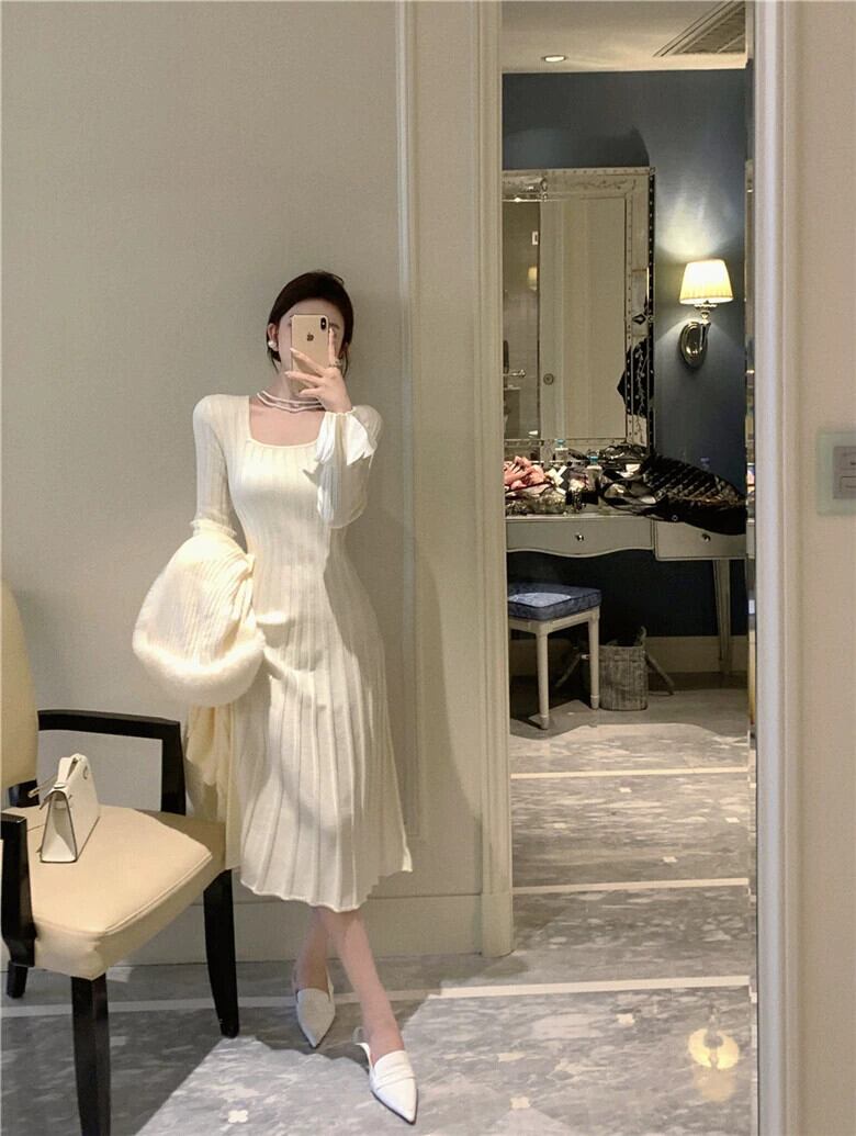 優しいスタイルのスクエアネック長袖ニットドレスの女性の 2024 春の新しい気質痩身ミッドレングススカート ロング スプリング 春物 スクウェア 092191344485968