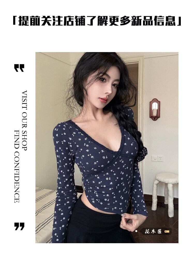 レトロな甘い花柄スプライシングレース V ネック Tシャツ女性の 2024 年春の新しいスリムフィットと多用途のショートトップ 大人ガーリー スウィート キュート カジュアル スプリング 春物 Vネック 0921924832811681