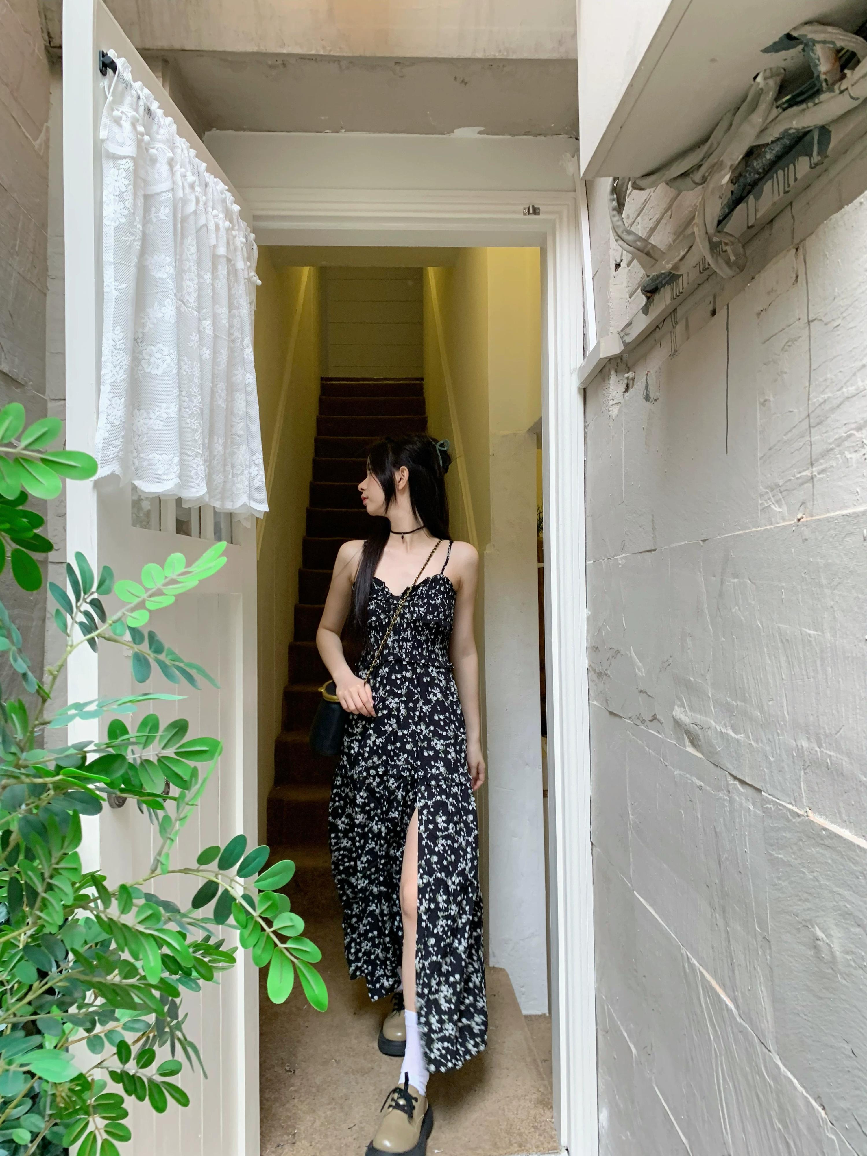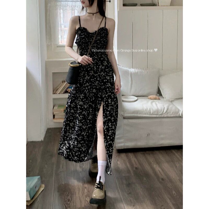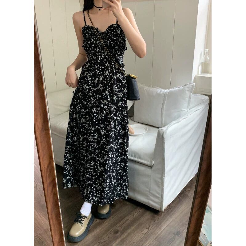 レトロなスタイルの花サスペンダードレス女性の夏 2024 新しいミッドレングスウエスト痩身スリットチューブトップスカート サマー 夏物 花柄 0921970054560228