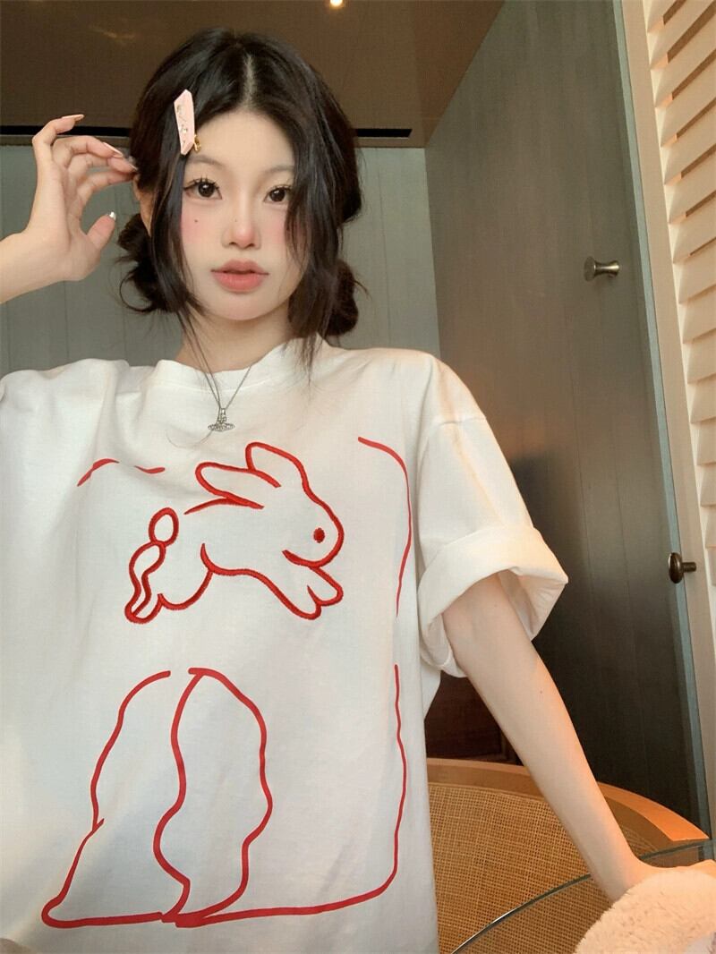 柔らかくてかわいいウサギの刺繍半袖 Tシャツ女性の夏の 2024 新しいスタイル怠惰なスタイルルーズで多目的なガーデンカラートップ レッド 大人ガーリー スウィート キュート カジュアル サマー 夏物 0921960160543054
