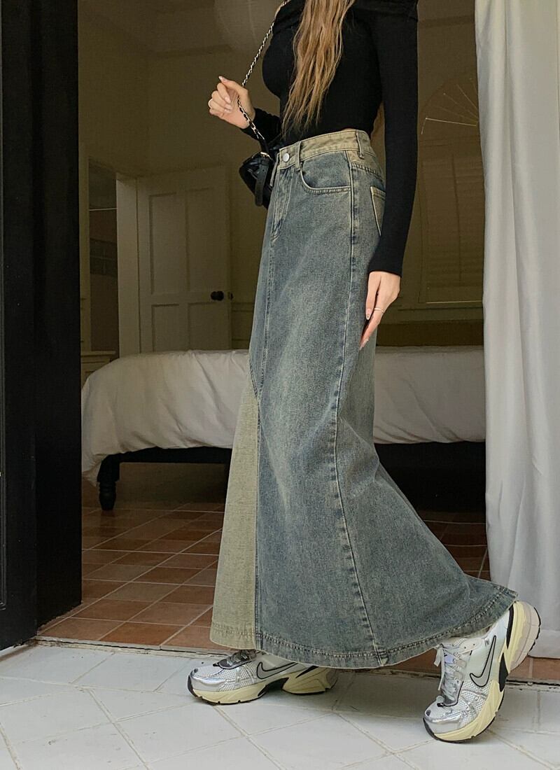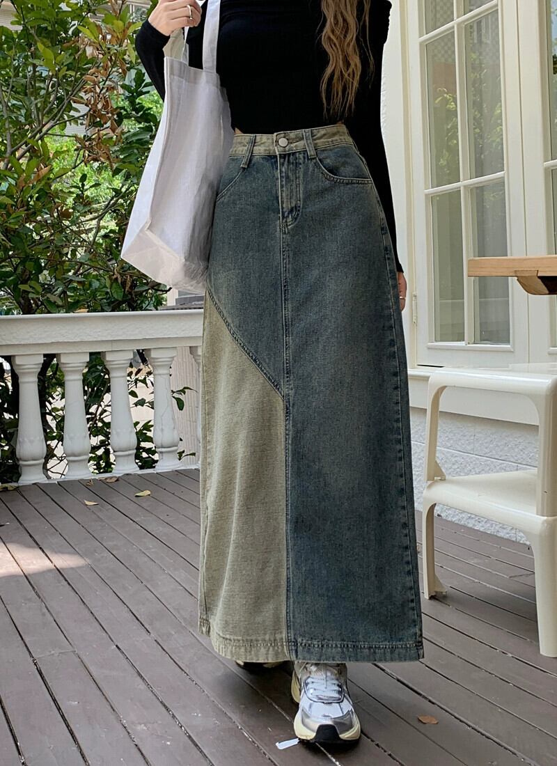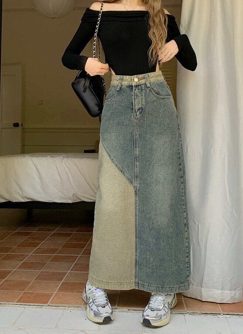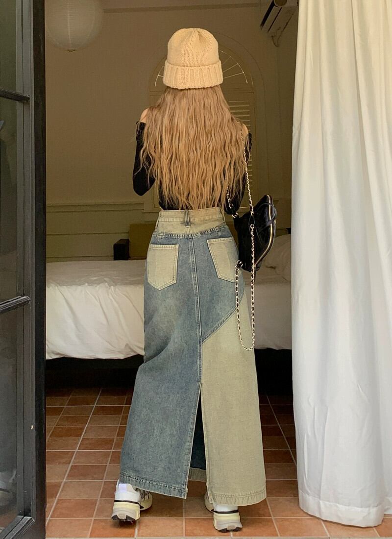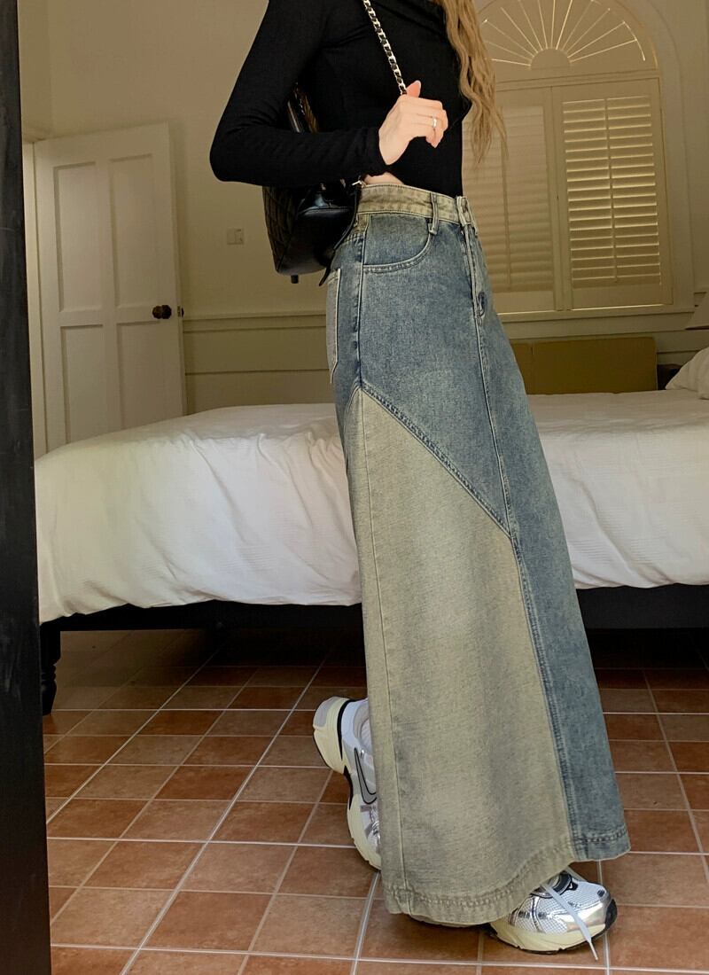ステッチコントラストカラーバックスリットデニムスカートレディース春ハイウエストデザインゆったりとしたミモレ丈スカートで股間をカバーし着痩せ見えます ハイウェスト スプリング 春物 0921944795459980