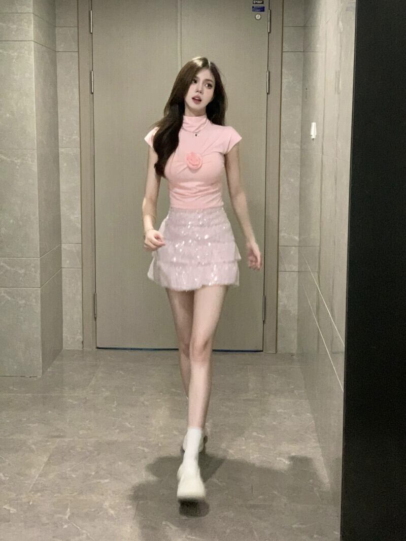 甘いピンクの花タートルネックトップスパンコールスカートスーツ女性の春 2024 純粋な欲望多用途ツーピースセット 大人ガーリー スウィート キュート カジュアル スプリング 春物 ピュア フラワーデザイン 0921979349981008