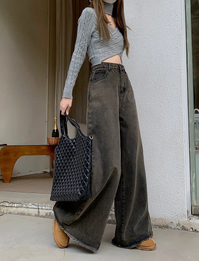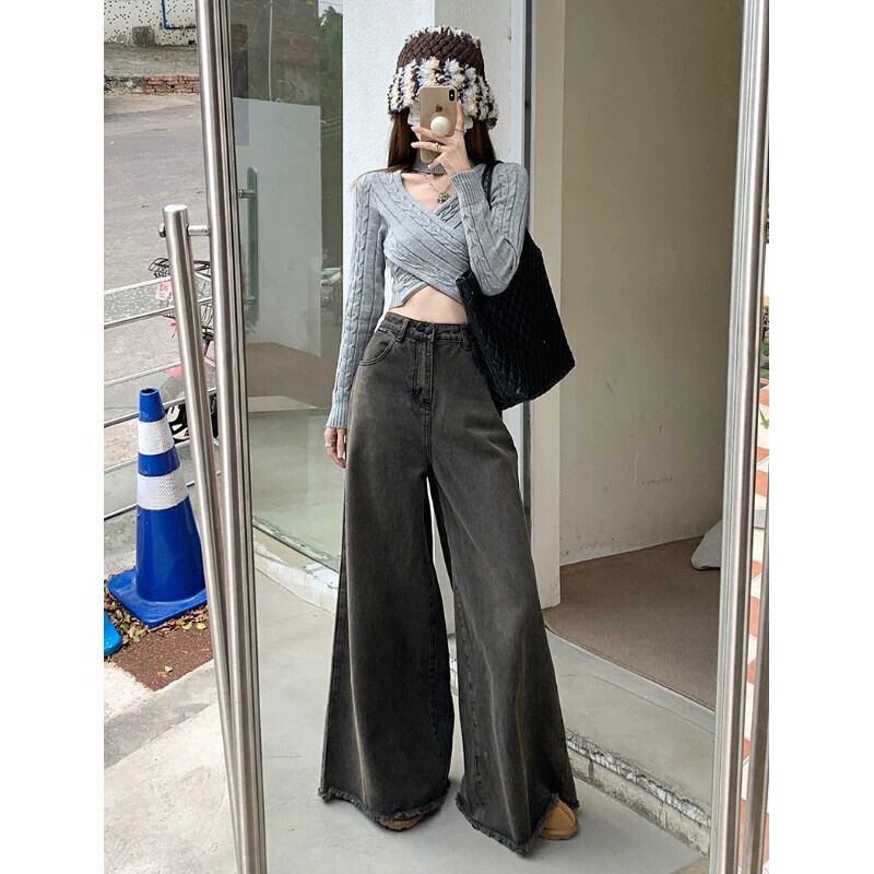 レトロウォッシュブラックグレーローエッジジーンズ女性春 2024 新デザインハイウエストスリムワイドレッグパンツ ハイウェスト スプリング 春物 ワイドパンツ 0921924027587534