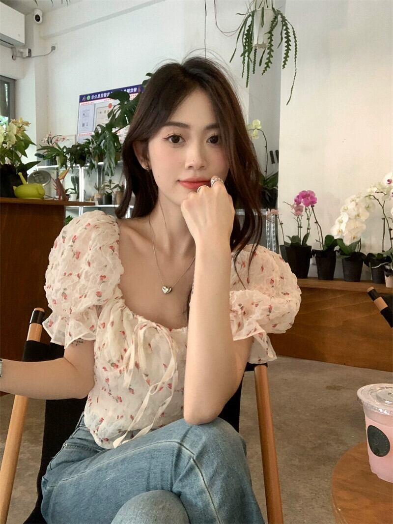 フレンチパフ半袖花柄シャツ女性の夏 2024 新しいスクエアネックシャツデザインストラップショートトップ サマー 夏物 スクウェア 0921969515452399