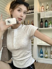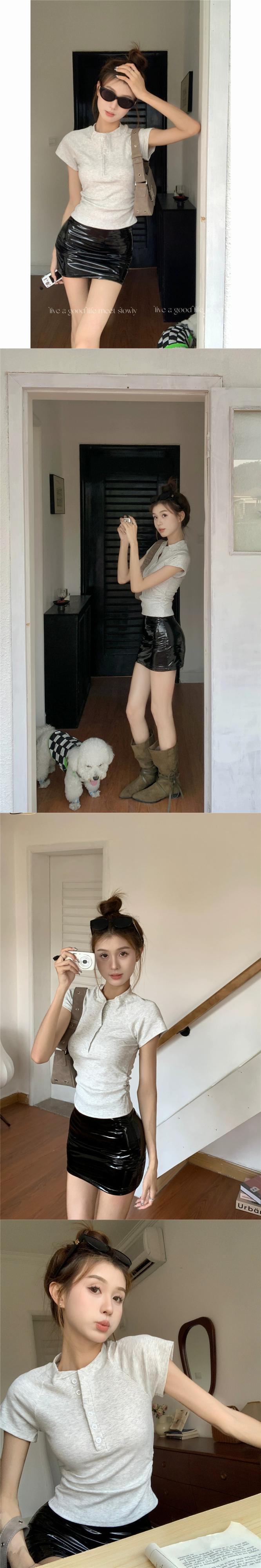 アメリカのハーフボタン襟弾性半袖 Tシャツ女性の夏の 2024 新しいデザインスリムフィットアウタートップトレンディ エラスティック 伸縮 サマー 夏物 0921935761945145