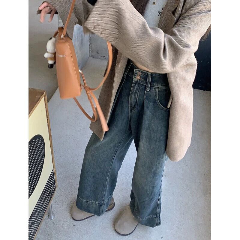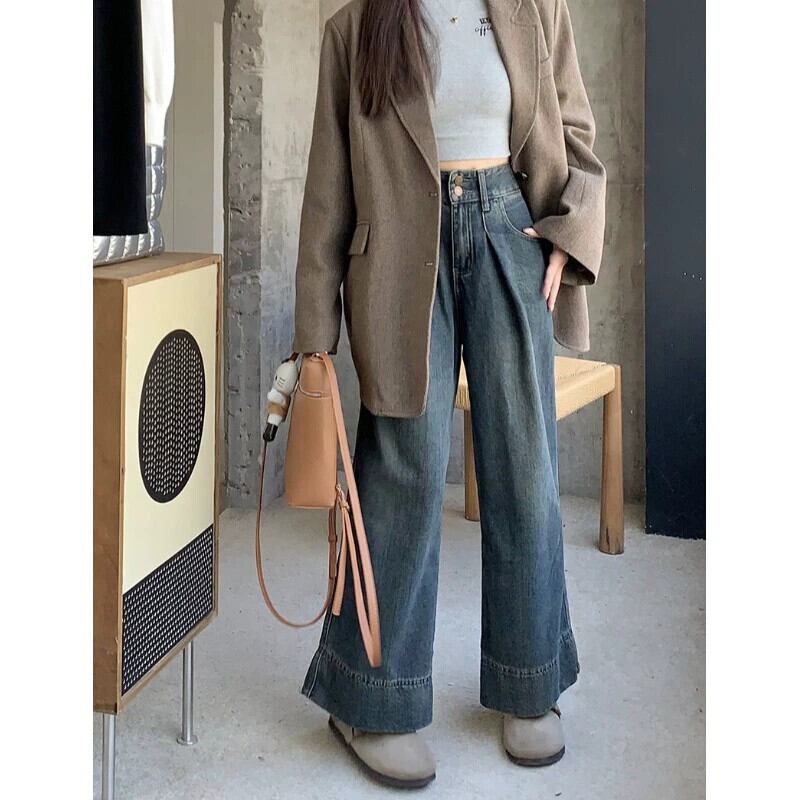 レトロユーズド加工ウエストジーンズ女性の冬 2024 ルーズストレートパンツ多用途ワイドレッグフロアモップパンツ ウィンター 冬物 ワイドパンツ 0921952772173798