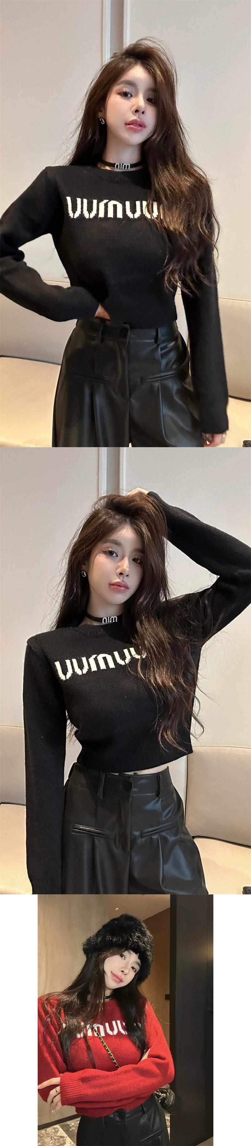コントラストレター多目的肥厚ショートセーター女性冬 2024 新スタイルスリムラウンドネック長袖セーター ロング ウィンター 冬物 Oネック 0921937347455628