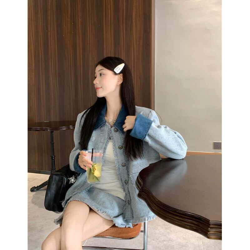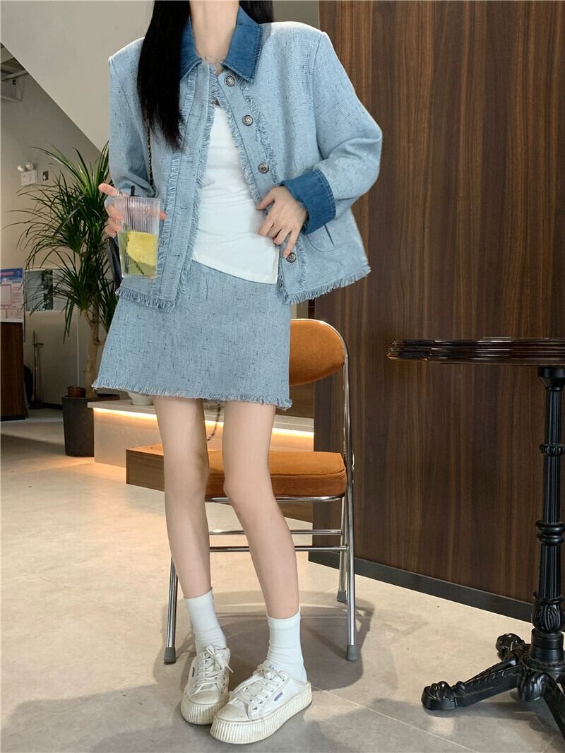 Xiaoxiangfeng スーツ レディース 春スプライス ラペル ローエッジ ジャケット ウエスト A ライン スカート 2 点セット スプリング 春物 Aライン 0921984889820087