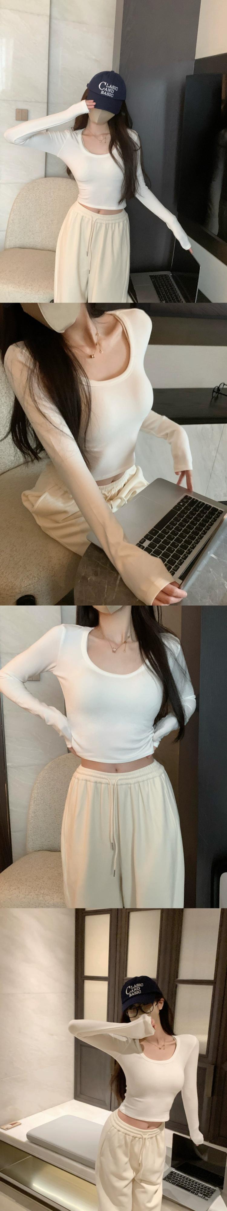 ホワイト U ネック長袖右肩 Tシャツ女性春セクシーなスリムタイトショートインナー重ね着シャツトップ ロング スプリング 春物 092195132308891
