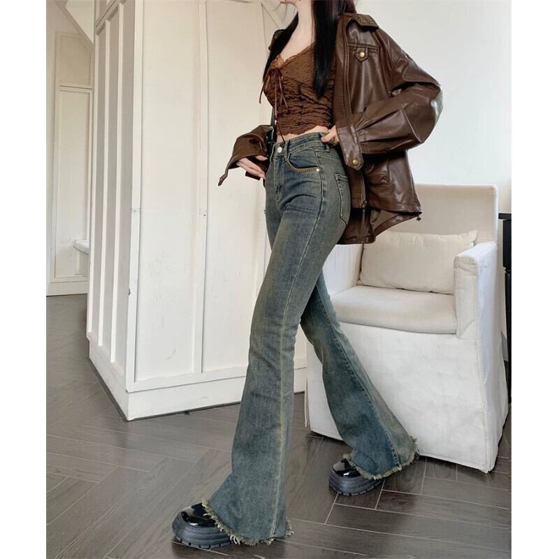 ホットガールレトロブルーウエストジーンズ女性の春 2024 スリムフィットわずかにフレア生エッジフロアモップパンツ レッド スプリング 春物 0921994149279871