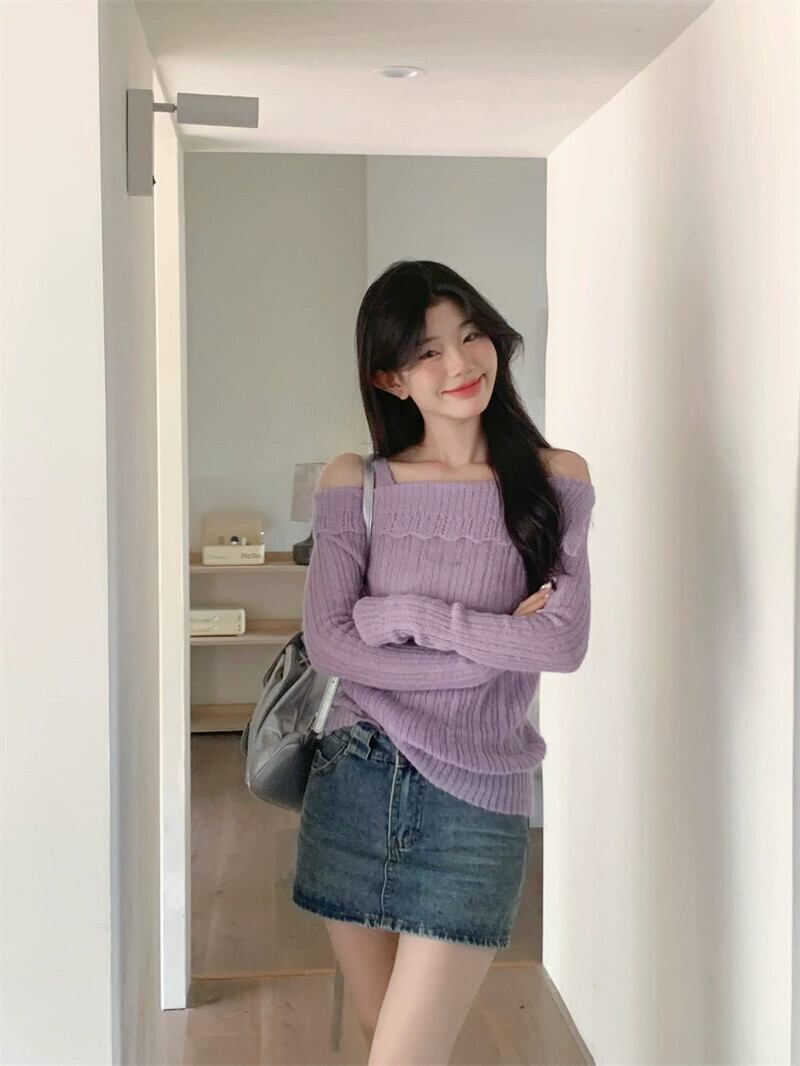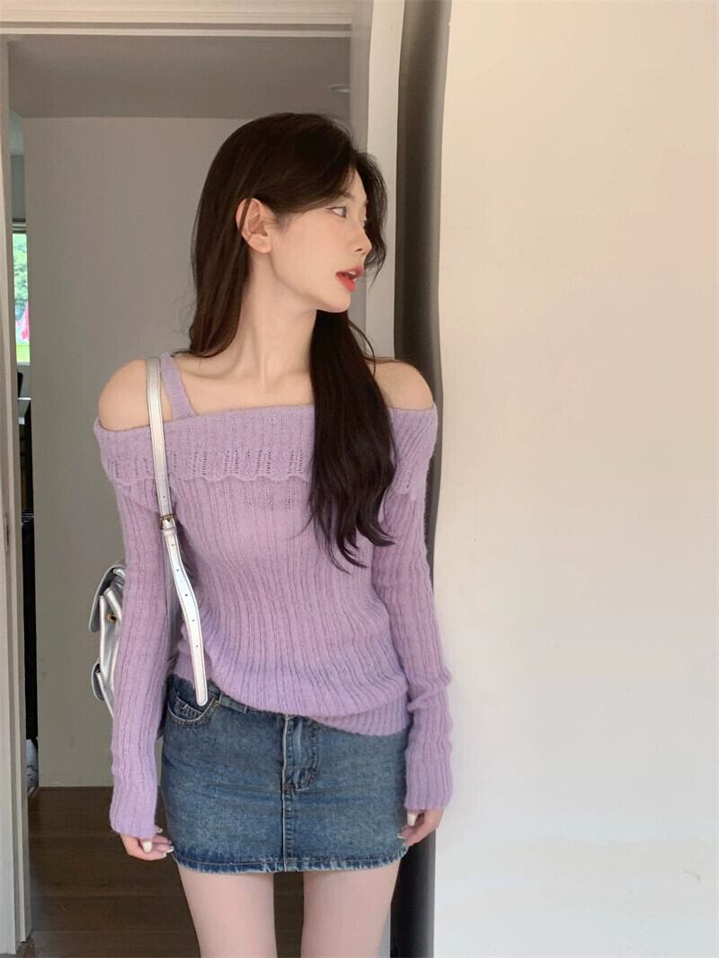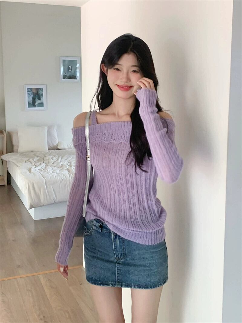 大気紫ワンライン襟長袖セーター女性春 2024 新しいスタイル優しい痩身ベースセーター ロング スプリング 春物 パープル 0921934266568901