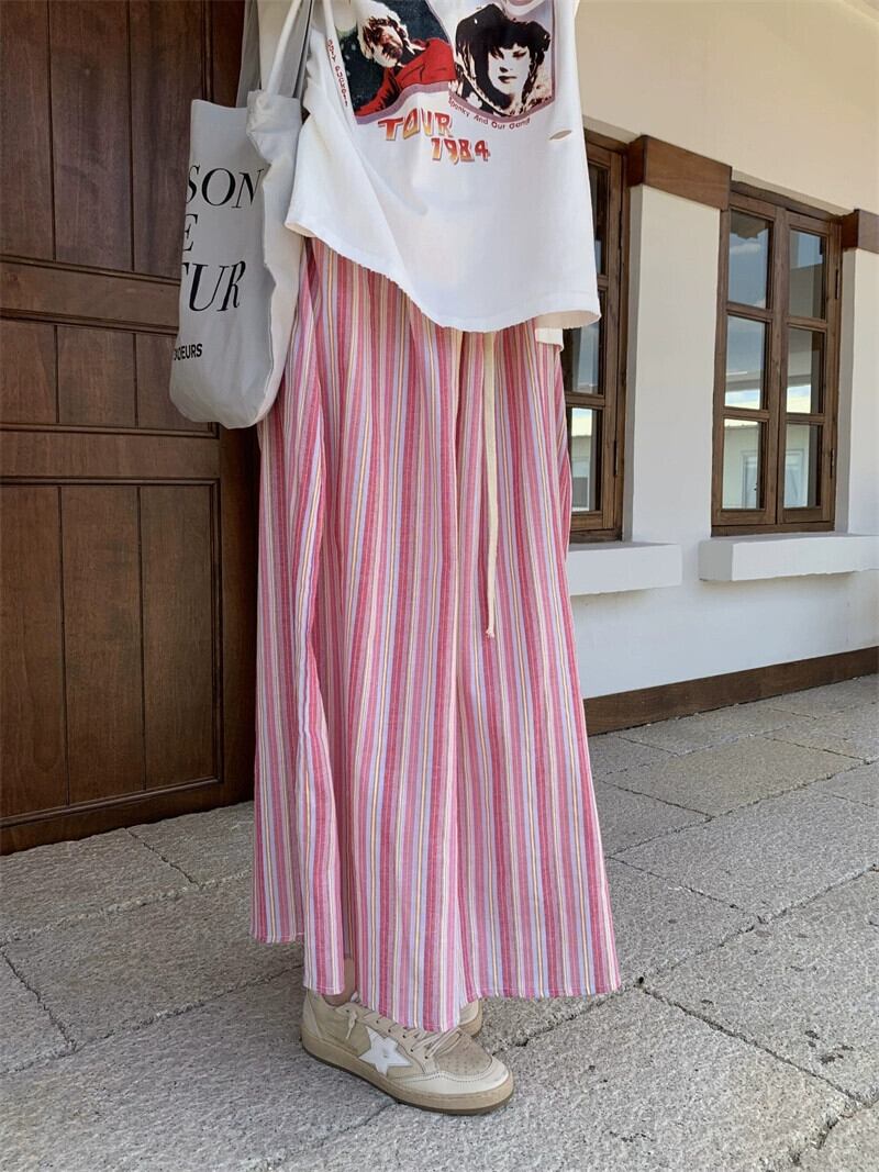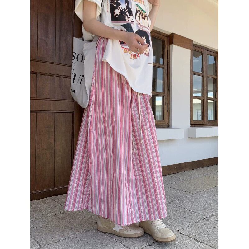 小さな新鮮で甘い年齢を軽減するストライプのスカートの女性の 2024 年の夏の新しい弾性ハイウエスト A ラインロングスカート エラスティック 伸縮 大人ガーリー スウィート キュート カジュアル サマー 夏物 Aライン 092194596080262