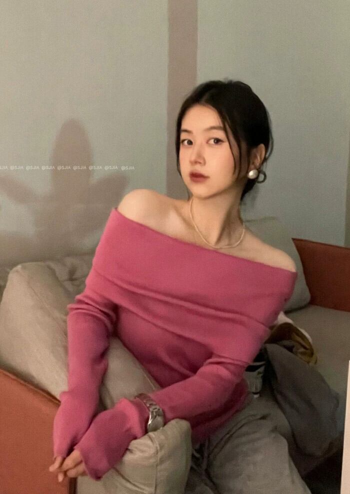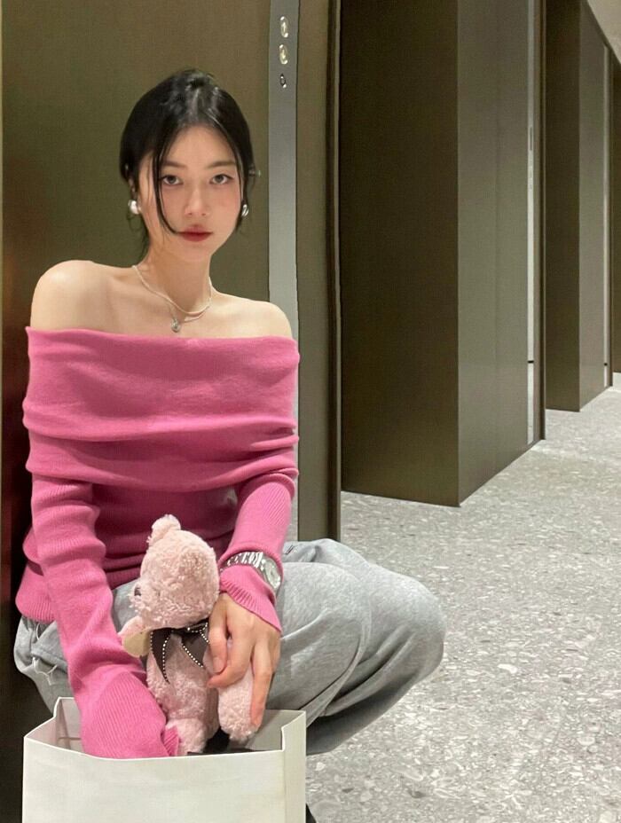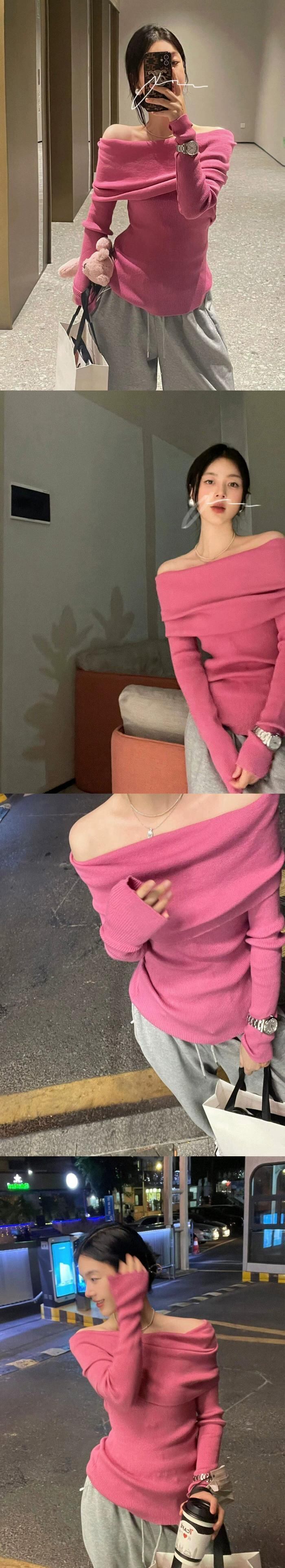 優しいピンクのワンライン襟デザインニットセーター女性春 2024 新しい気質痩身ショートトップ スプリング 春物 0921926834563200