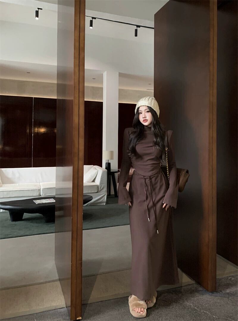 純粋な欲望スタイルカジュアルスーツ女性春起毛スリムハイカラー長袖トップハイウエストスカートロングスカート 2 点セット ハイウェスト スプリング 春物 0921967129792644