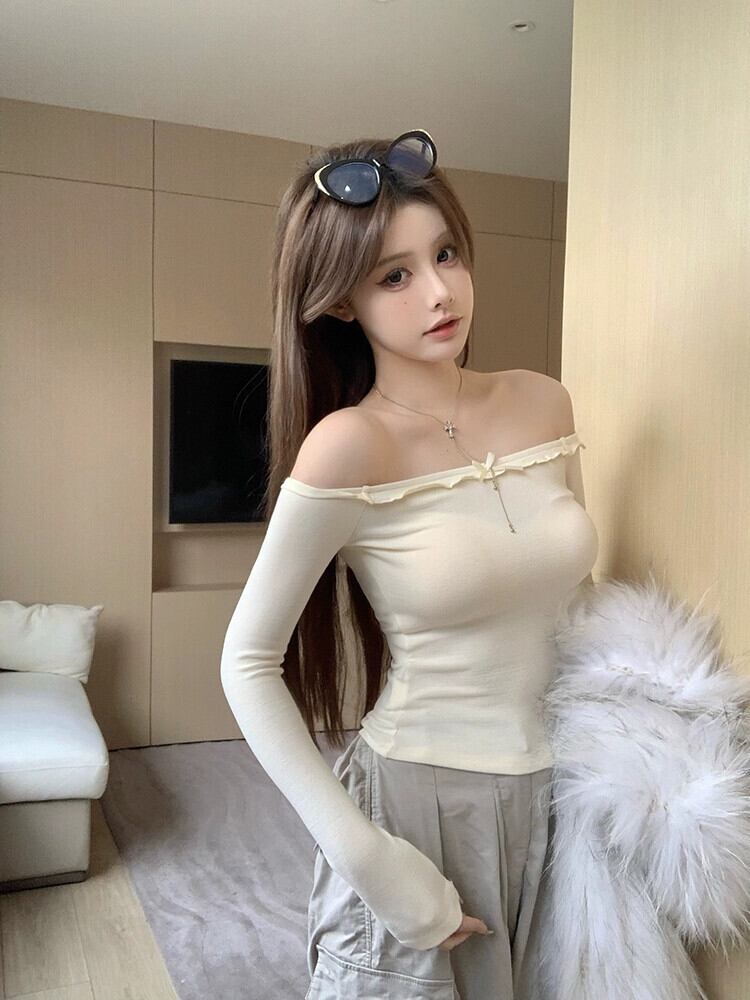 純粋な欲望多用途ワンラインカラーリボン T シャツレディース 2024 年春の新しいスリムフィットボトム長袖トップ ロング スプリング 春物 Tシャツ 0921974866441680