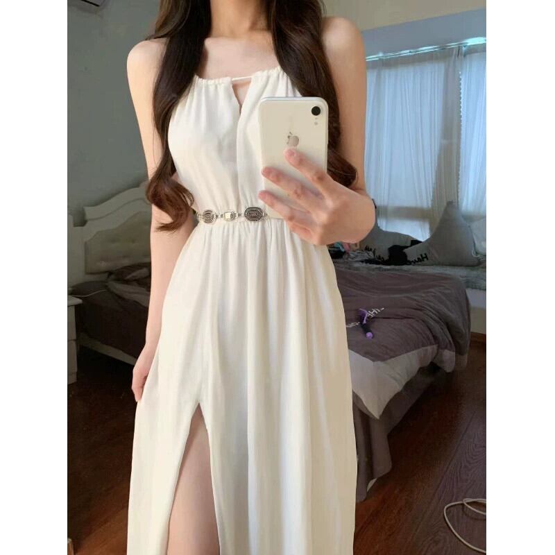 フレンチヘップバーンスタイル白いホルターネックドレス女性の夏の純粋な欲望セクシーなスリットロングスカート気質ノースリーブスカート ホワイト サマー 夏物 ピュア 0921943367140094