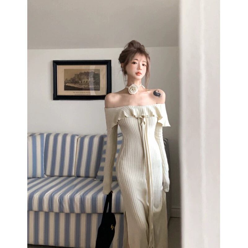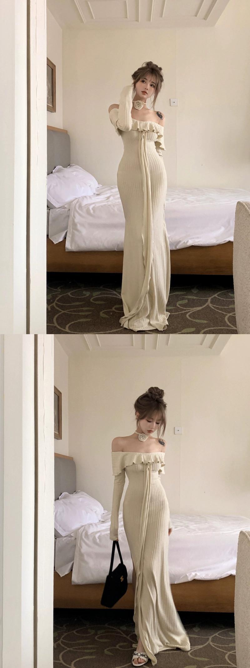 -end 気質ワンライン襟長袖ドレス女性 2024 春の新しいスタイルのフリルウエスト痩身スリットスカート ロング スプリング 春物 0921939796469300