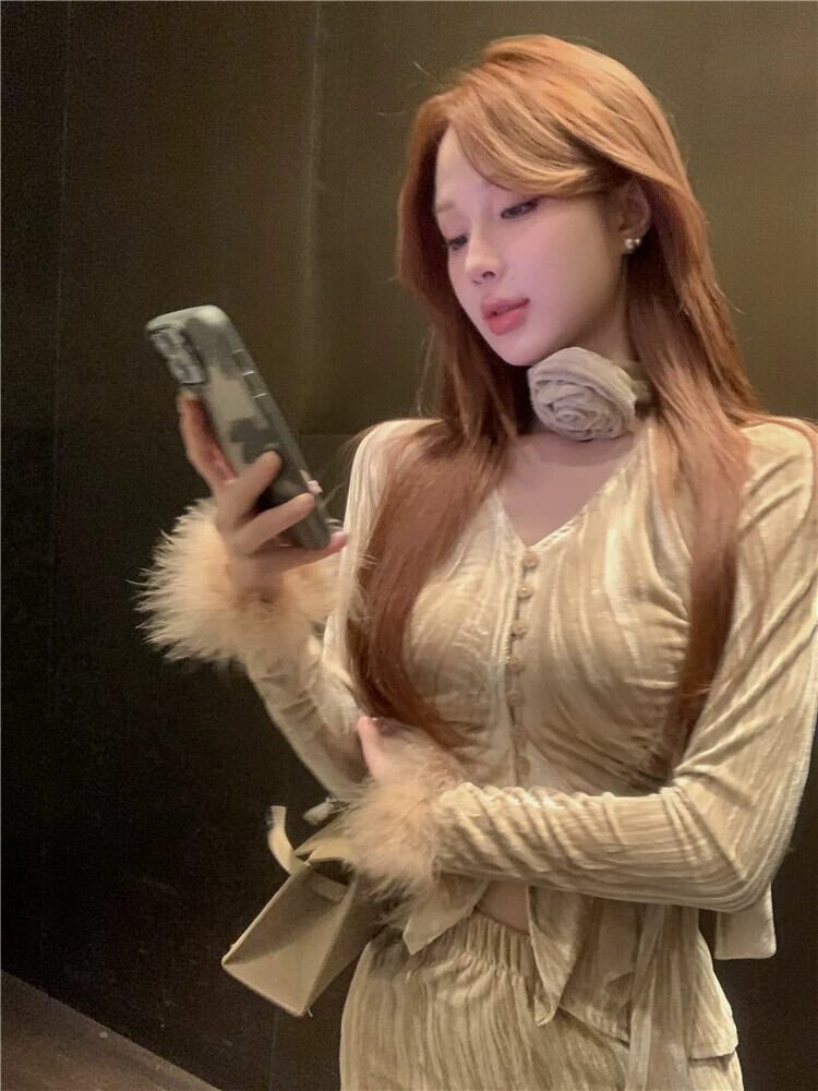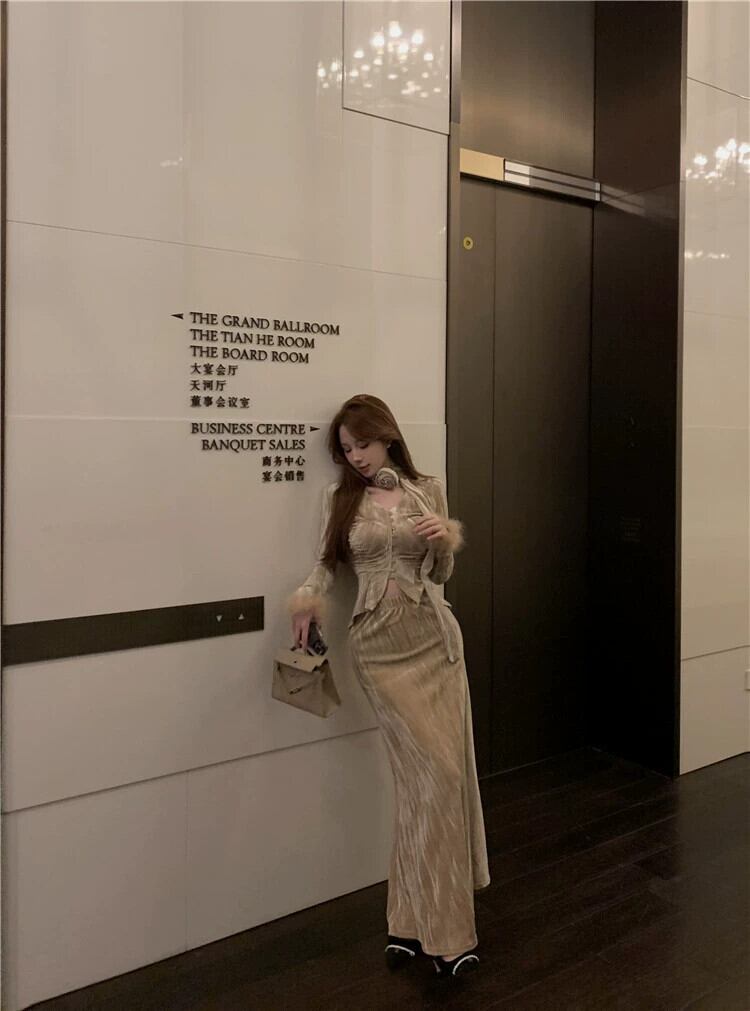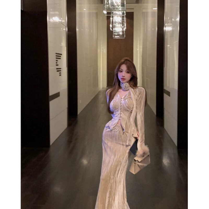 気質ベルベットスーツ女性 2024 春の新作長袖カーディガントップハイウエストスリムスカートツーピーストレンディセット ロング スプリング 春物 0921919862812610