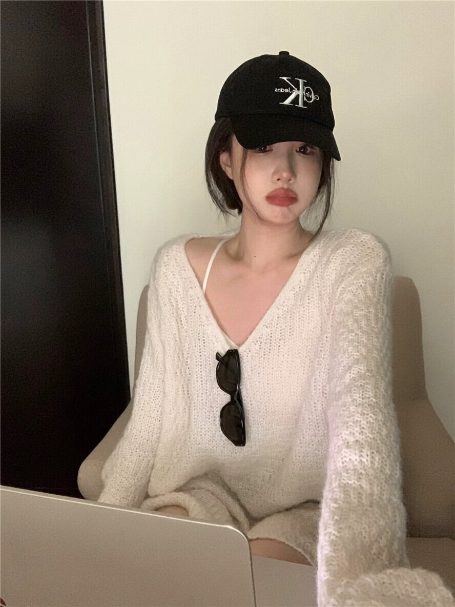 穏やかで怠惰なスタイルの V ネック長袖セーター女性春スタイルルーズ白いセーター中空純粋な欲望トップ ロング ホワイト スプリング 春物 Vネック ピュア 0921980209648265