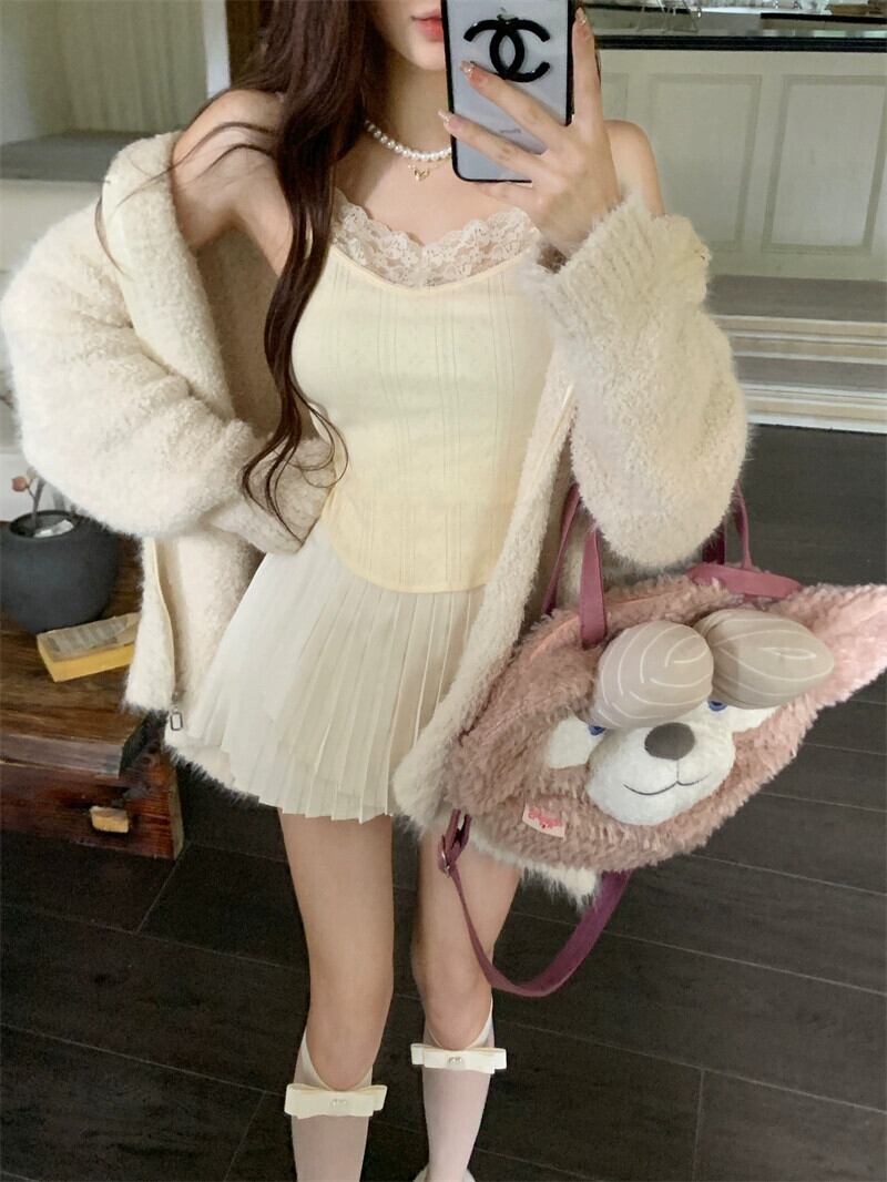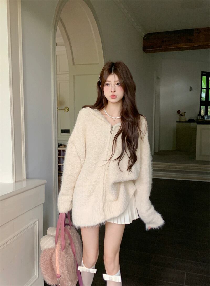 色:クリーム色のフード付きジャケット,アプリコットベスト,アプリコットプリーツスカート