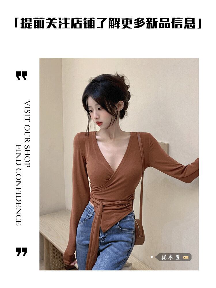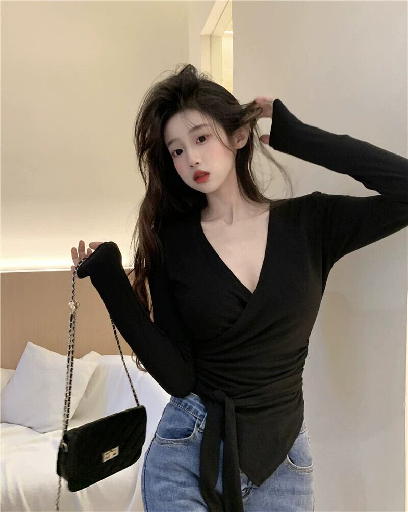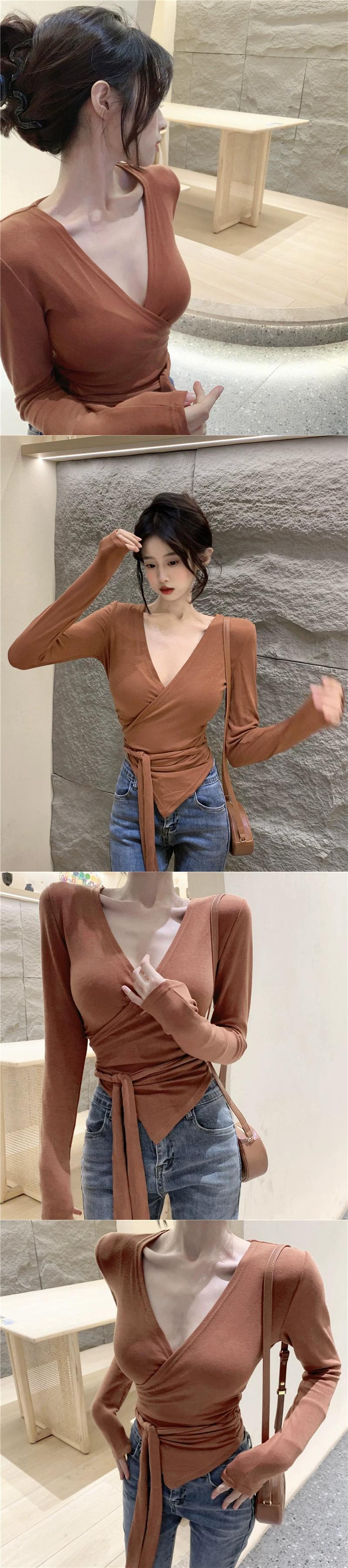 不規則な V ネック長袖プルオーバー Tシャツ女性春 2024 新スタイルストラップ痩身ショートボトシャツトップ ロング スプリング 春物 Vネック 0921979397421001