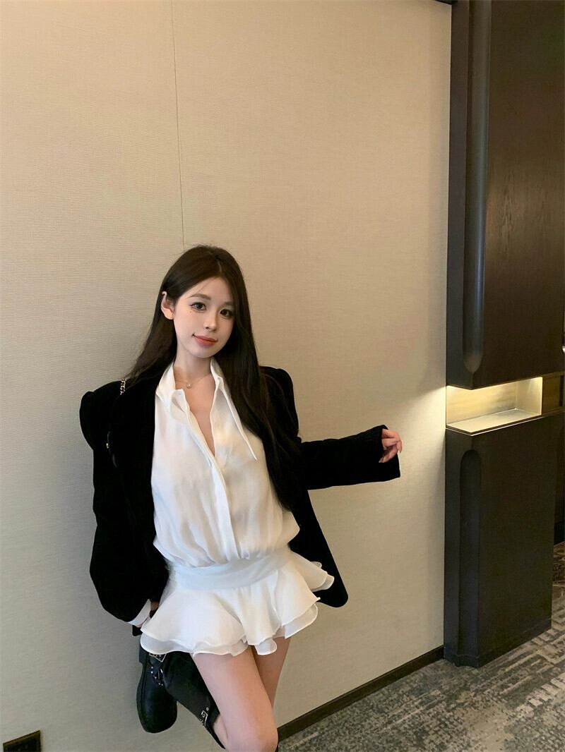 フリル長袖ポロカラーシャツドレスレディース、春の優しいスタイル、ウエストを締めるAラインのふくらみのあるショートスカート ロング スプリング 春物 0921913466472317