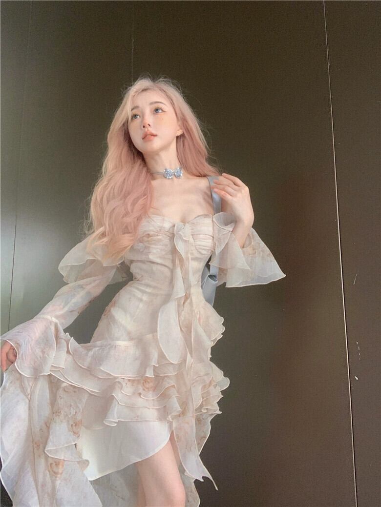 ワンショルダーの優しい汚れのあるトランペットスリーブの春の女性ドレス、ウエストを細くするフリルスカート、不規則なタキシードスカート スプリング 春物 0921914784986867
