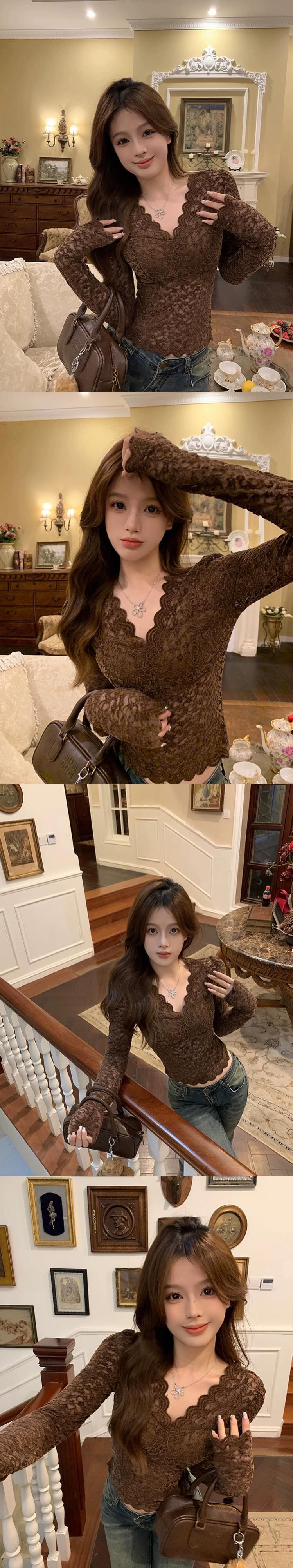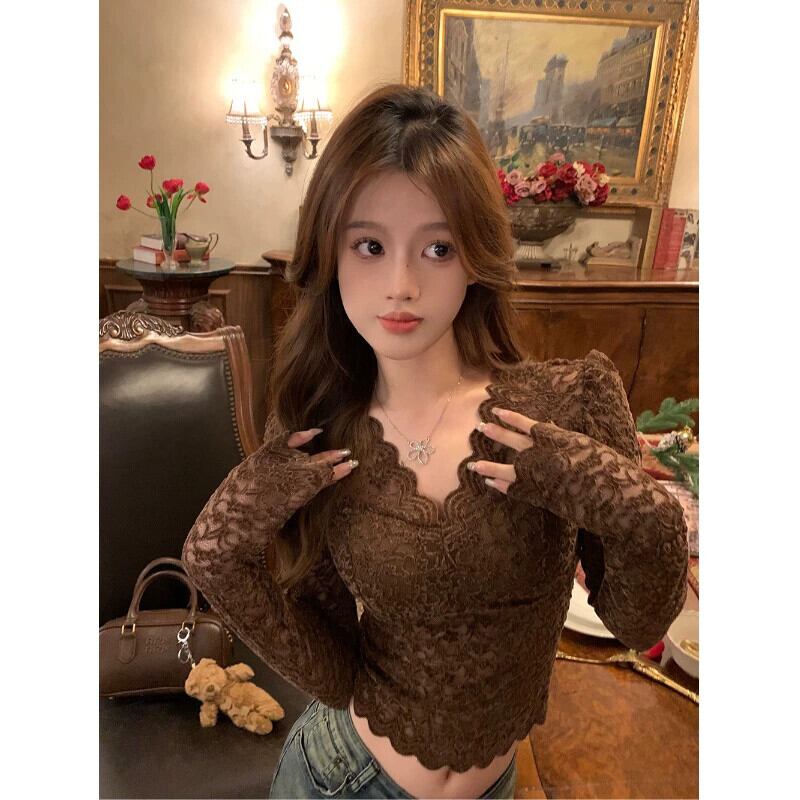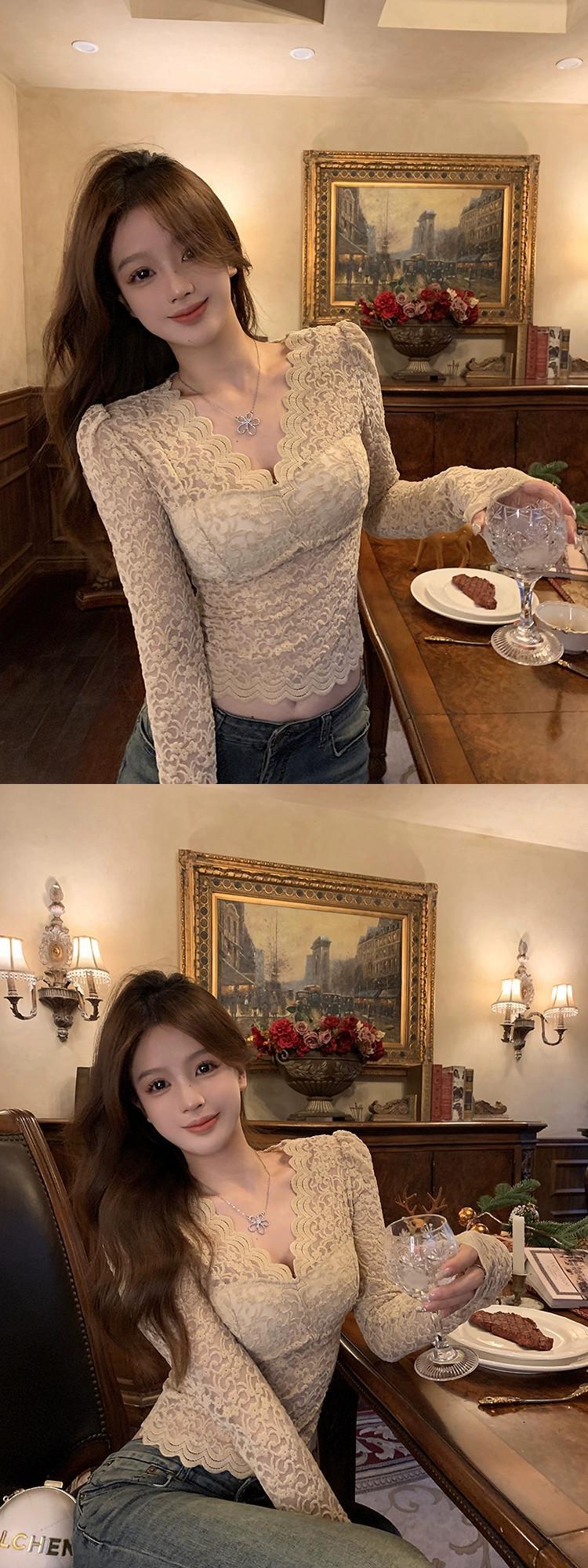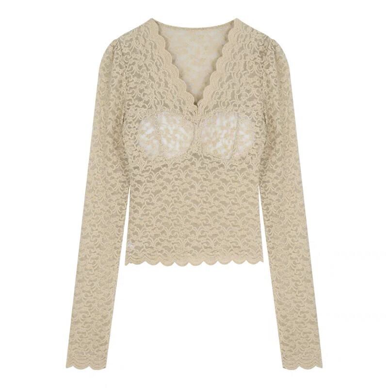 セクシーな v ネック中空長袖レースシャツ女性春 2024 新しいスタイルの気質ショートスリム痩身底トップ ロング スプリング 春物 Vネック 0921917560238979