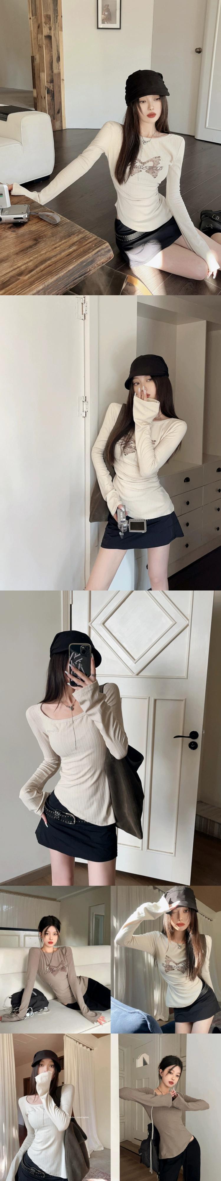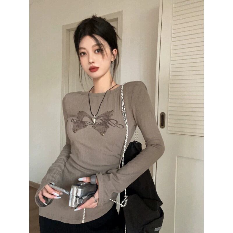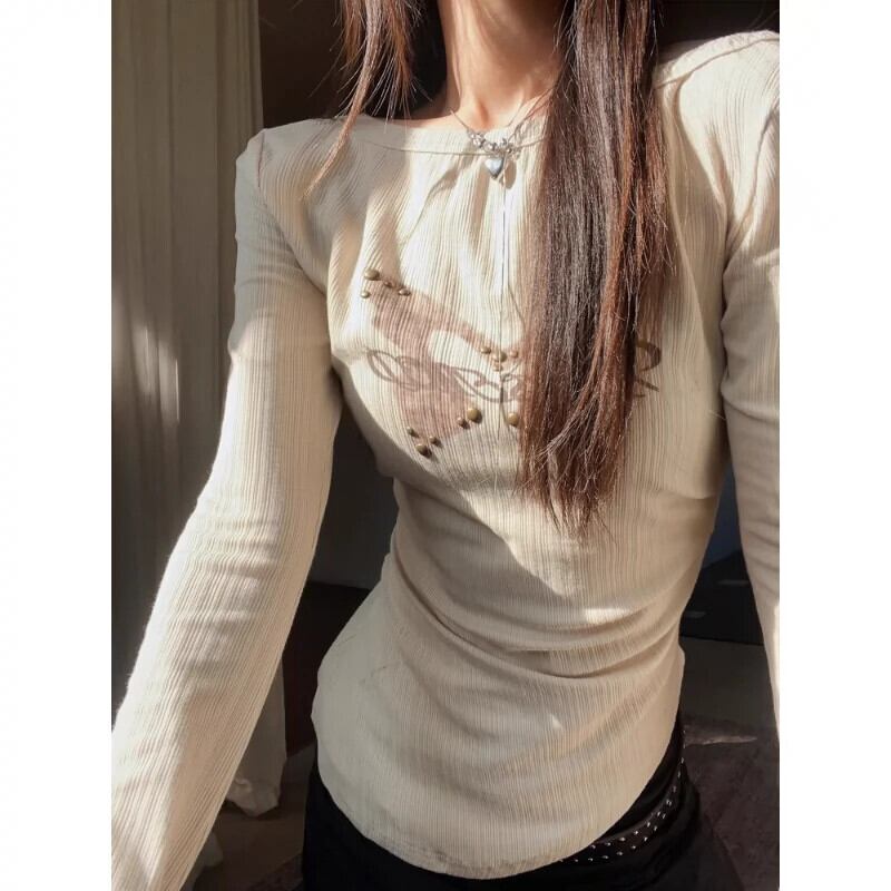 レトロプリント長袖ラウンドネック Tシャツ女性春 2024 新しい不規則なスリムフィットボトシャツトップイン ロング スプリング 春物 Oネック 0921934500263990
