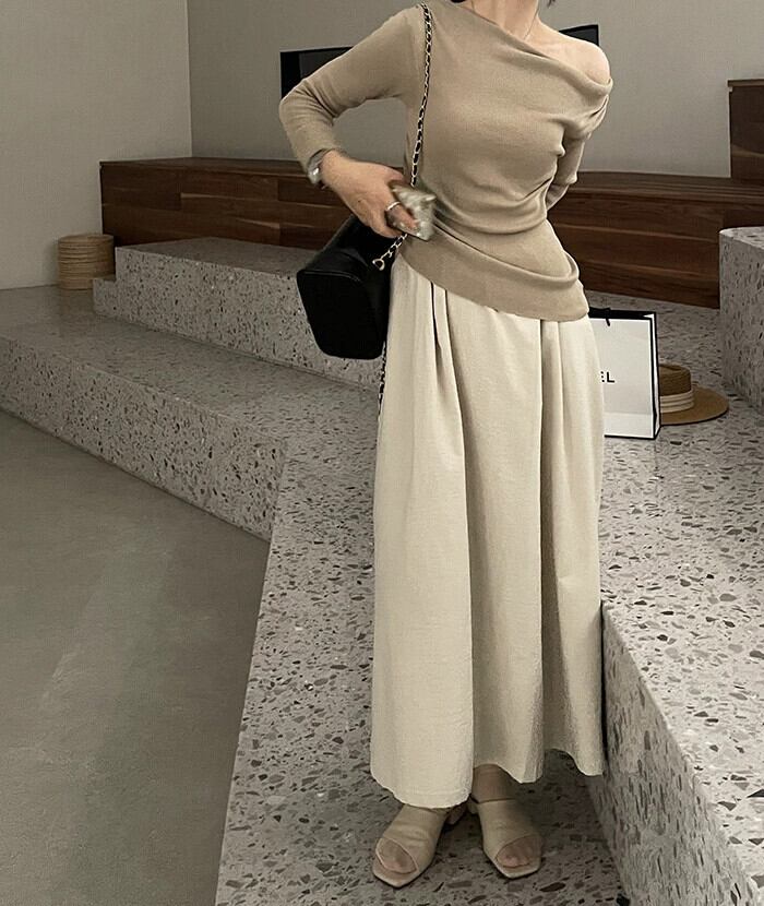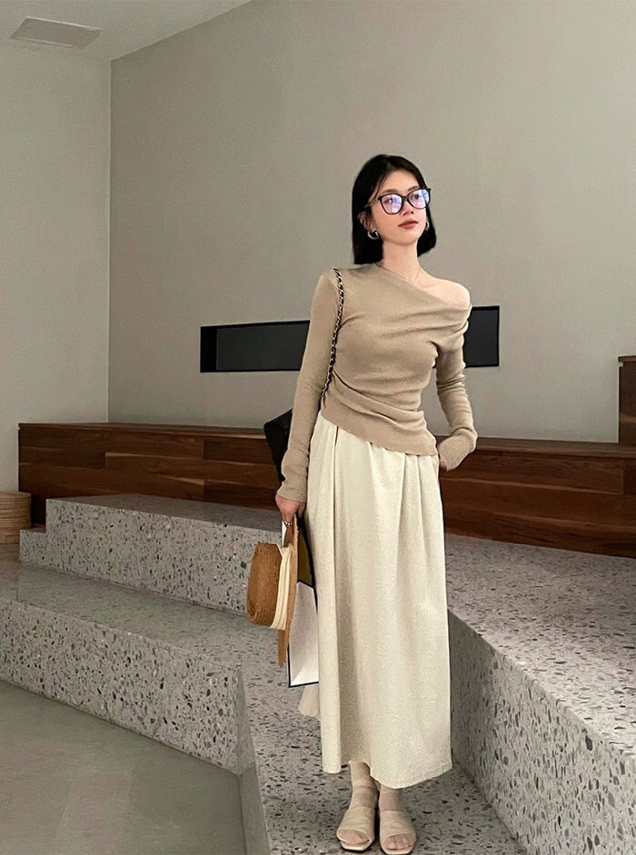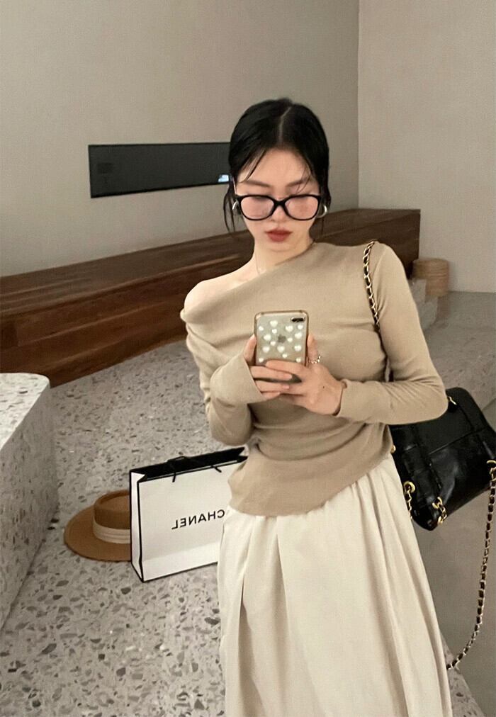 ワンショルダー長袖セーターレディース、春らしい優しいスタイルのシックなオフショルダーセーター、スリムショートインナーレイヤリングトップ ロング スプリング 春物 0921913008330694
