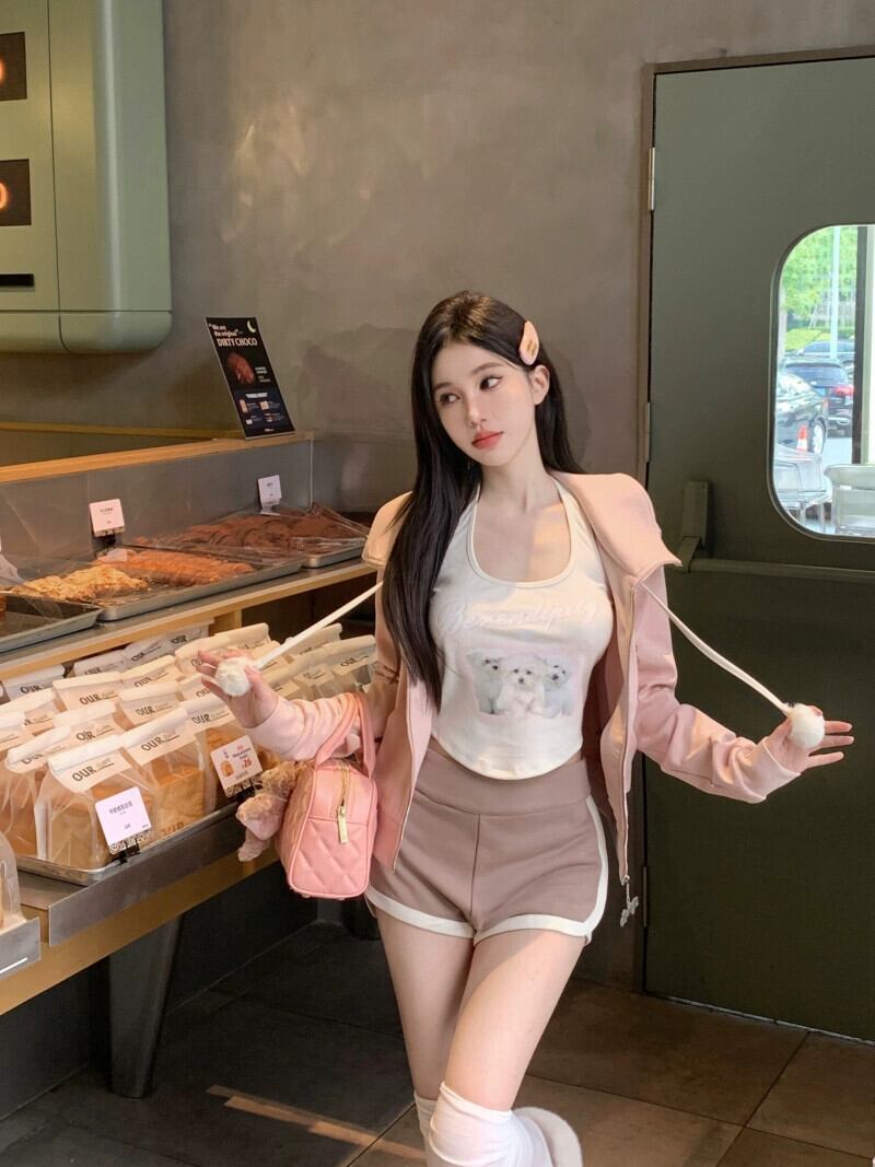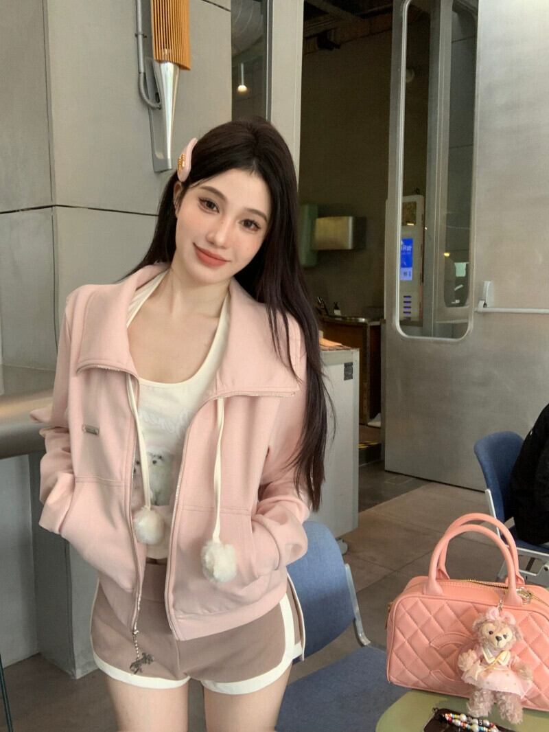 ハン・ガオ練習生は女性用3点セット、春ピンクのスウェットシャツ、ショートコート、ホルターネックベスト、ハイウエストショートパンツスーツを着ている スプリング 春物 ショーツ ブルマー 0921951625626581