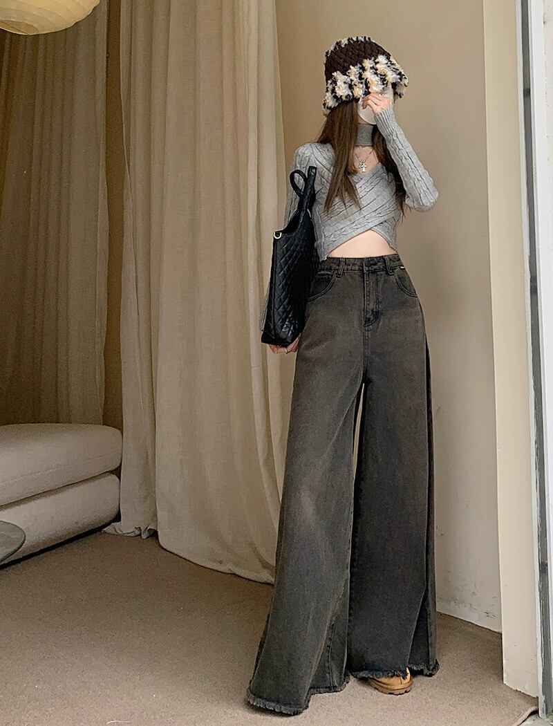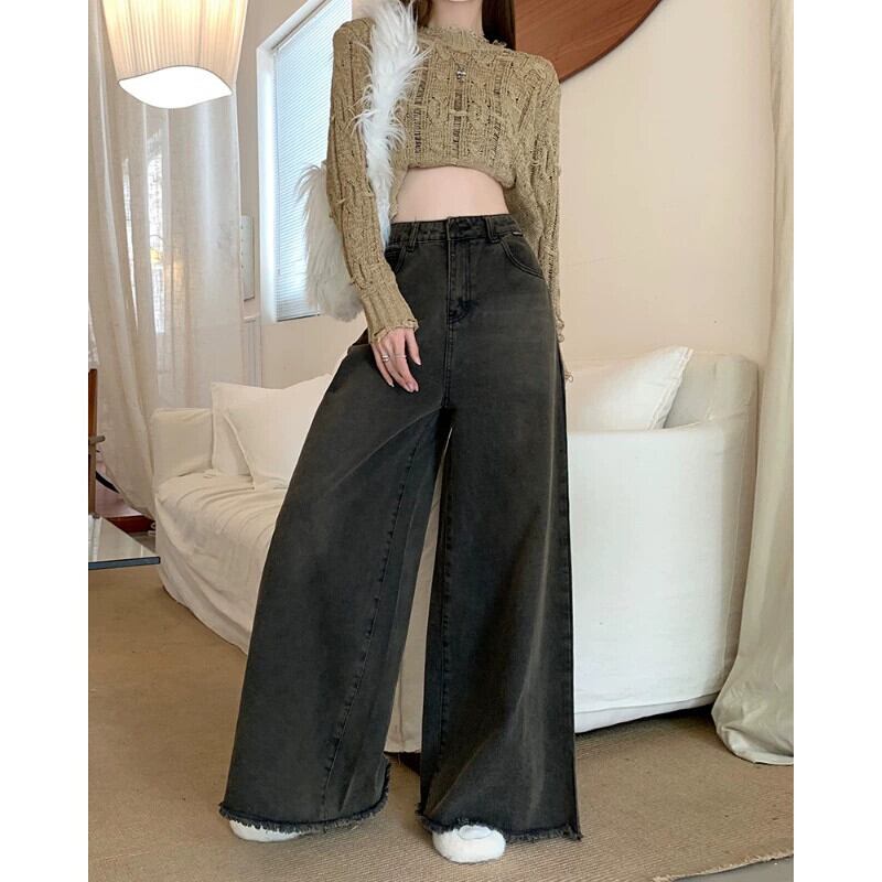 レトロウォッシュハイウエストスリムローエッジジーンズ女性 2024 春の新しいカジュアルルーズワイドレッグフロアレングスパンツ スプリング 春物 092198097782826