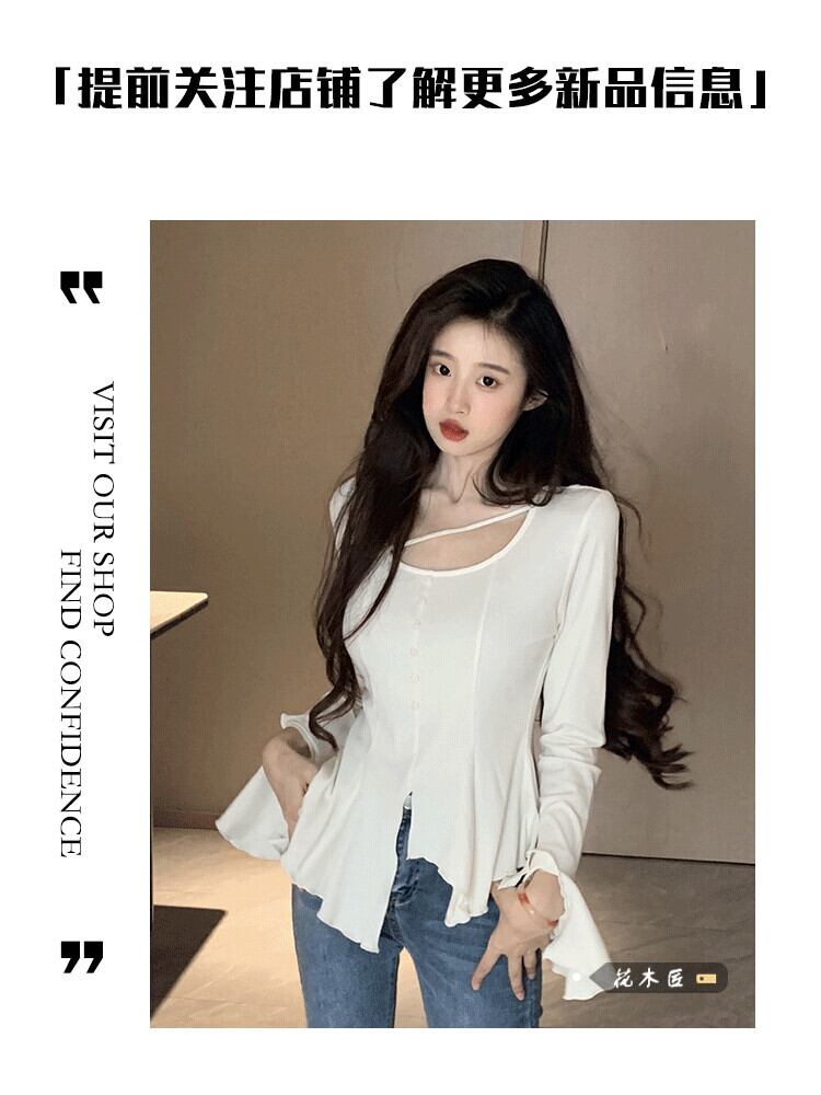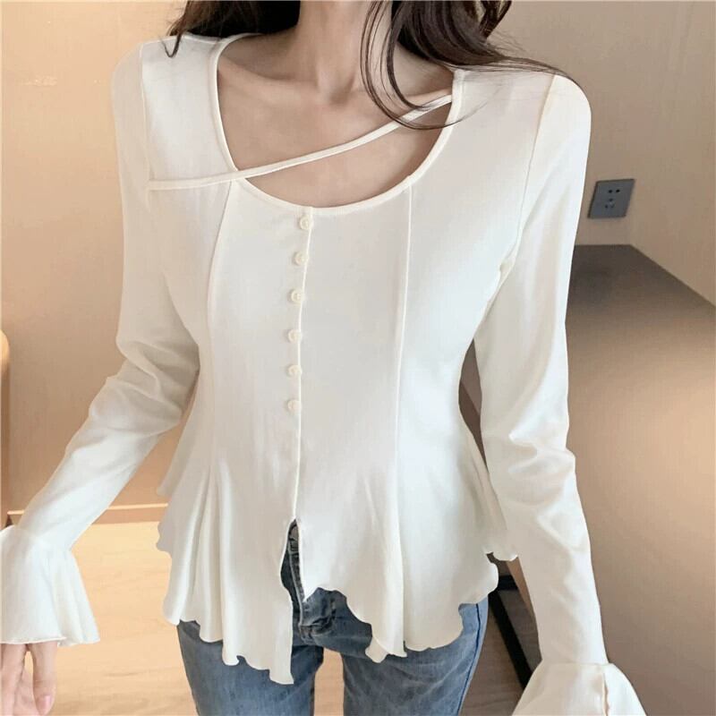 エドトランペットスリーブニッチ長袖ラウンドネック Tシャツ女性春 2024 新しい不規則なウエスト痩身トップ ロング スプリング 春物 Oネック 0921994891299457