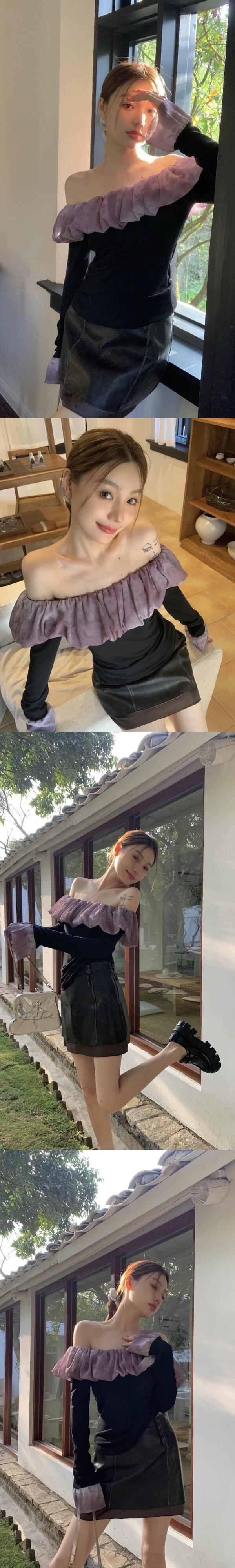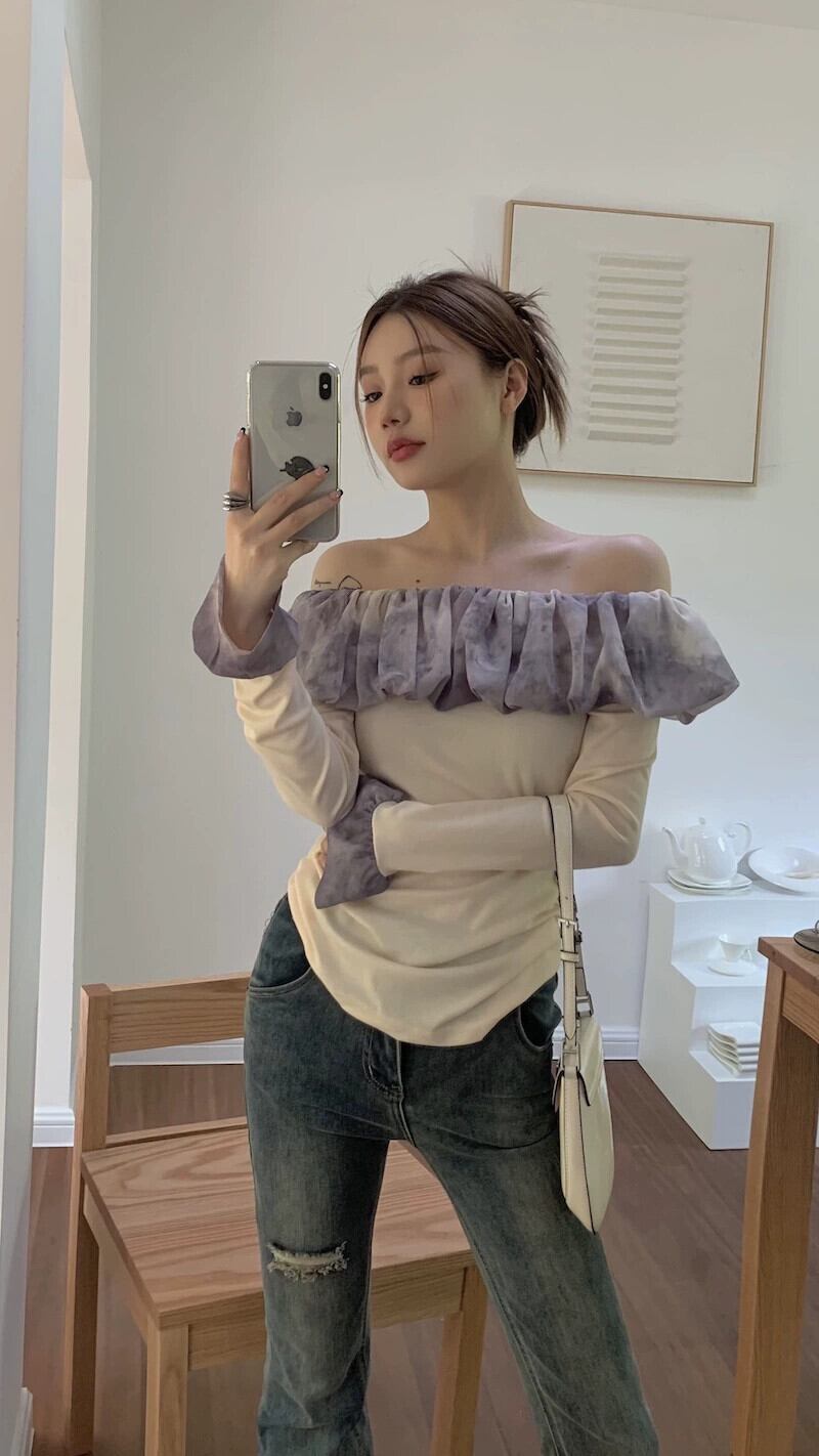 甘くてスパイシーなコントラストワンショルダートランペットスリーブ Tシャツ女性 2024 春の新しいセクシーなスタイルのオフショルダーストレッチスリムトップ 大人ガーリー スウィート キュート カジュアル スプリング 春物 0921912997074318