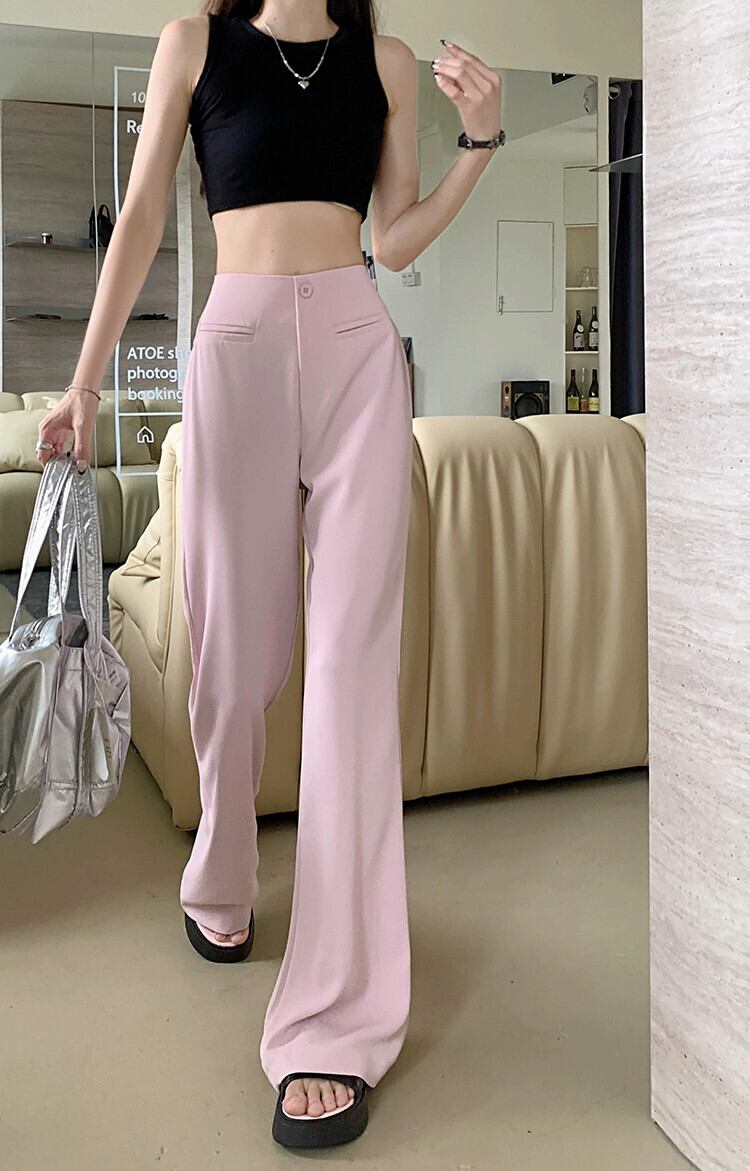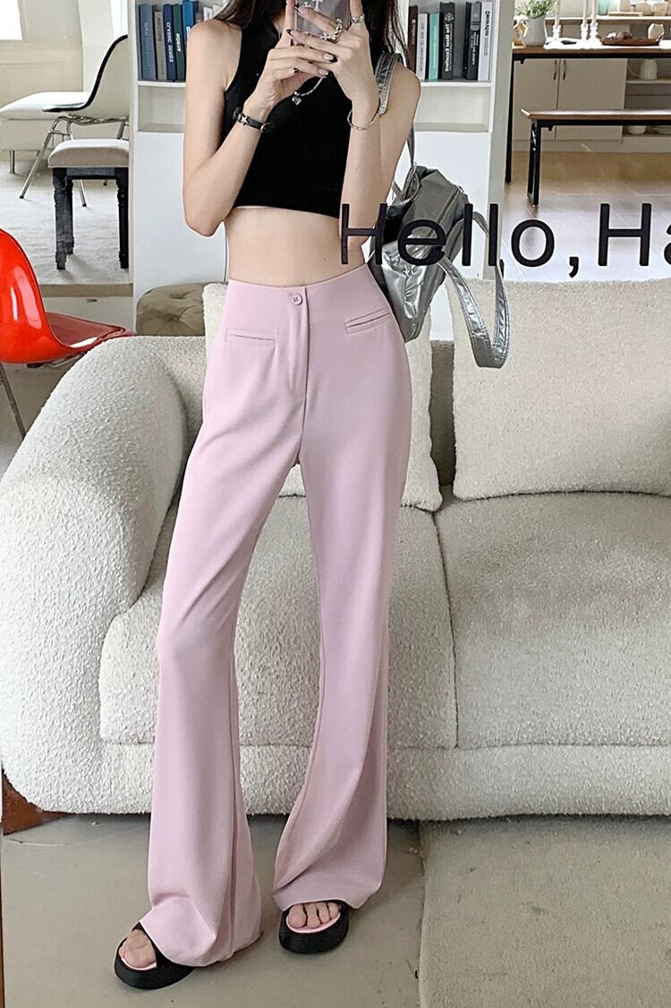 ピンクのわずかにフレアなカジュアル スーツ パンツ レディース、春ハイウエスト スリム ストレート パンツ、スリム フィット フレア パンツ、フロアレングス パンツ レッド スプリング 春物 09219349961953
