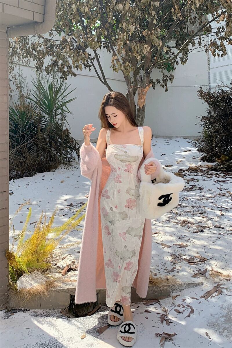 中国風の国民風プリントベルベットドレス女性 2024 春の新スリムスリムサスペンダーミッドレングススカート スプリング 春物 092195026756863