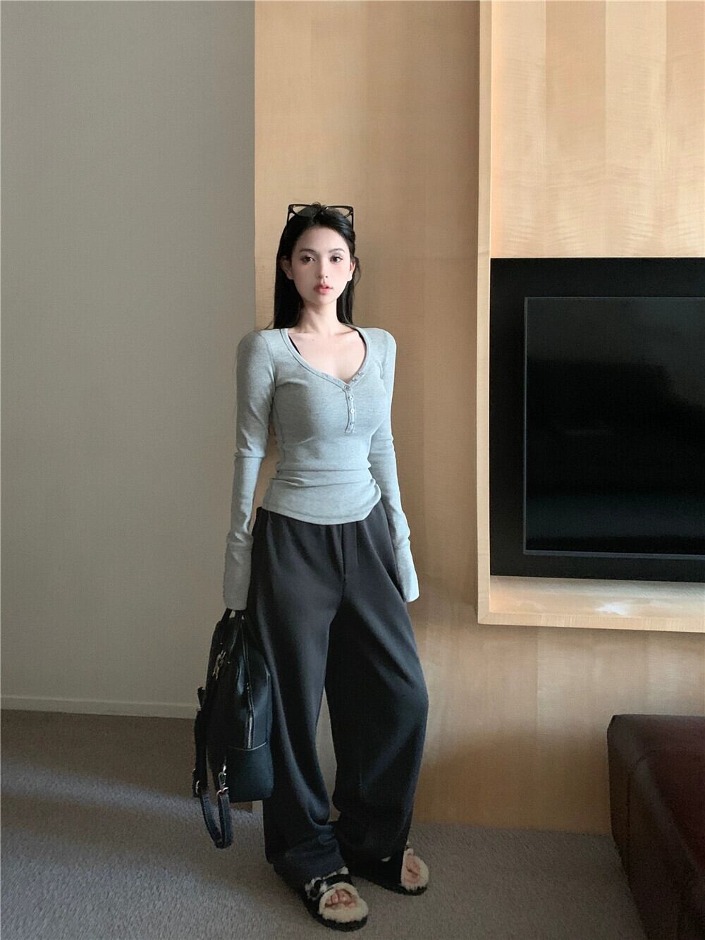 アメリカンレトロ V ネック無地長袖 Tシャツ女性 2024 春の新しいスタイルのインナースリムフィットインナーベーストップ ロング スプリング 春物 Vネック ソリッドカラー 092198083926593