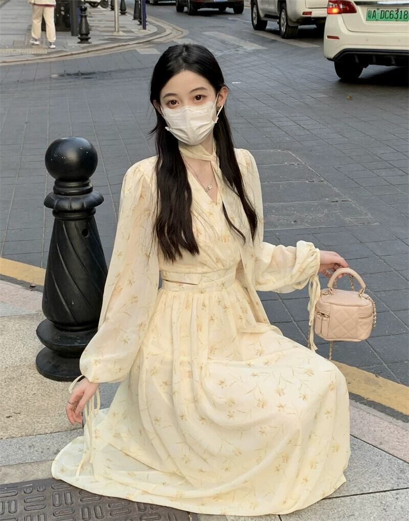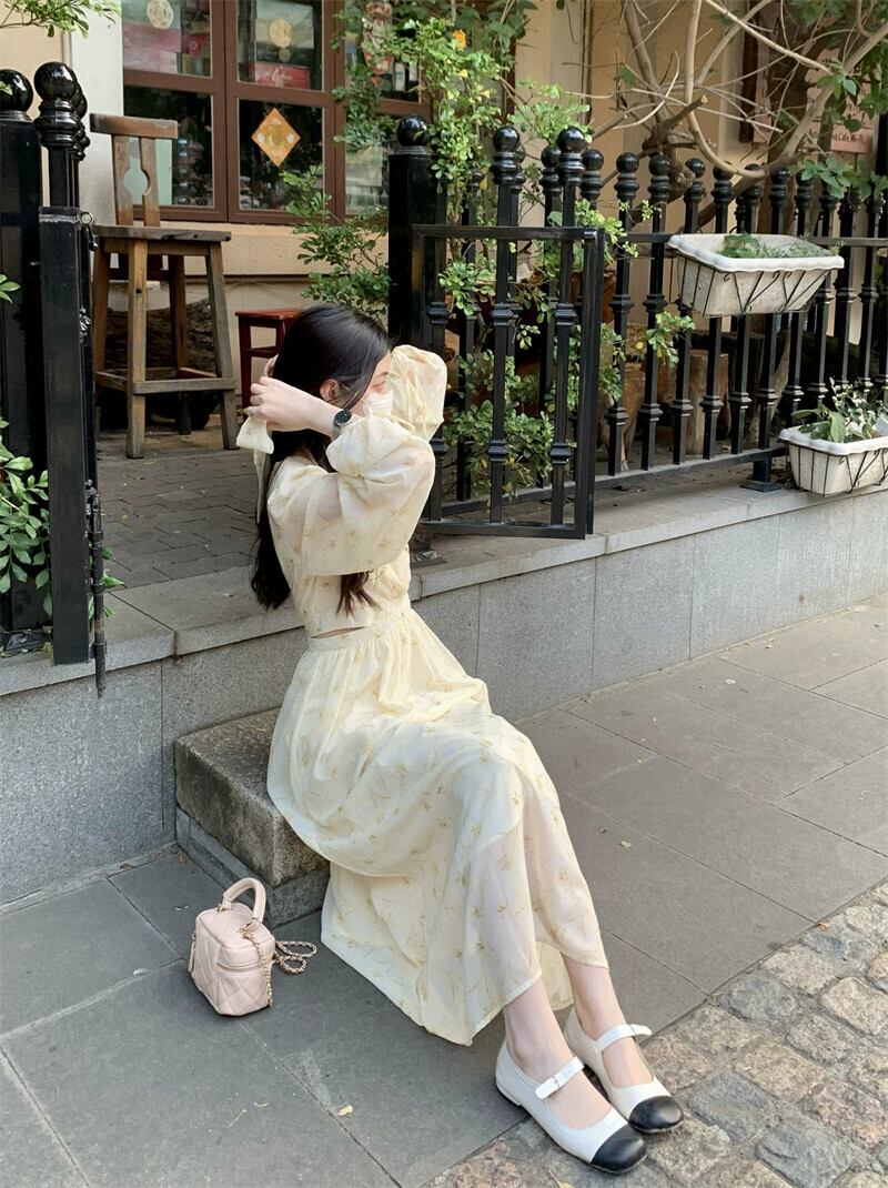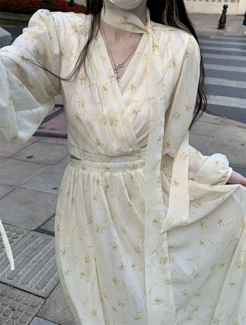 優しい花柄ワンピースレディース春フレンチVネックコーヒーブレイクワンピースウエスト痩せパフスリーブロングスカート スプリング 春物 0921950341383363