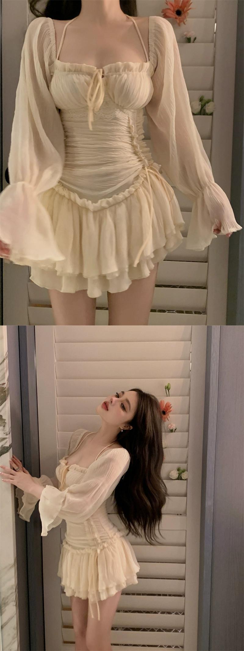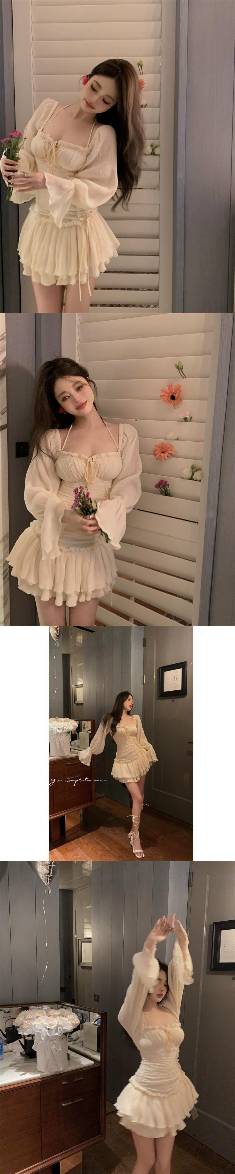 純粋な欲望甘いホルターネックトランペット長袖ドレス女性春 2024 スタイルウエスト痩身パフスカート ロング 大人ガーリー スウィート キュート カジュアル スプリング 春物 0921987256816471