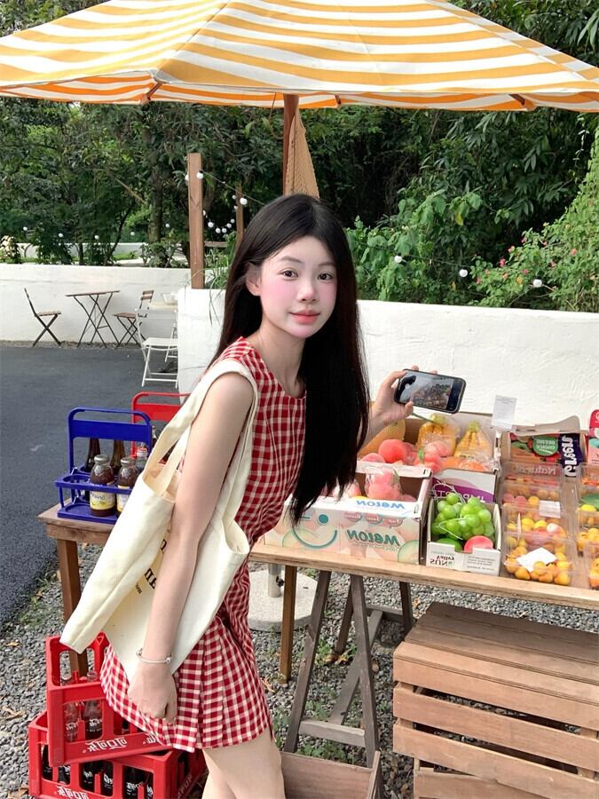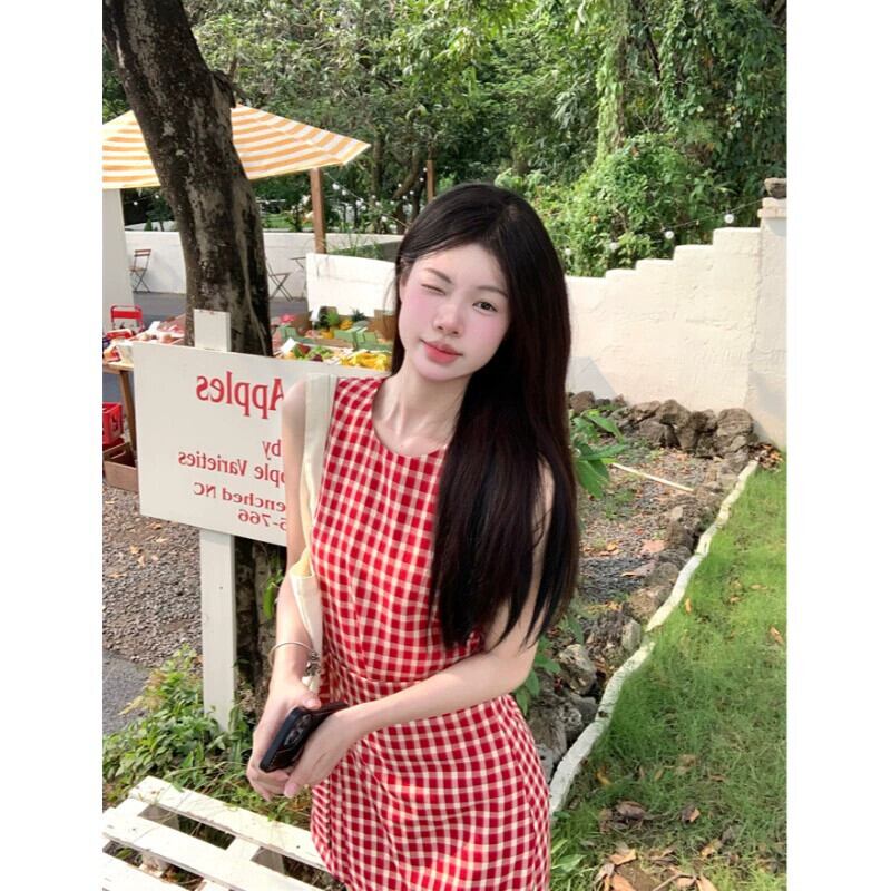 レッドチェック柄レースノースリーブドレス女性の春 2024 スタイルフレンチタンクトップドレスウエスト A ラインショートスカート スプリング 春物 Aライン 092196244746850