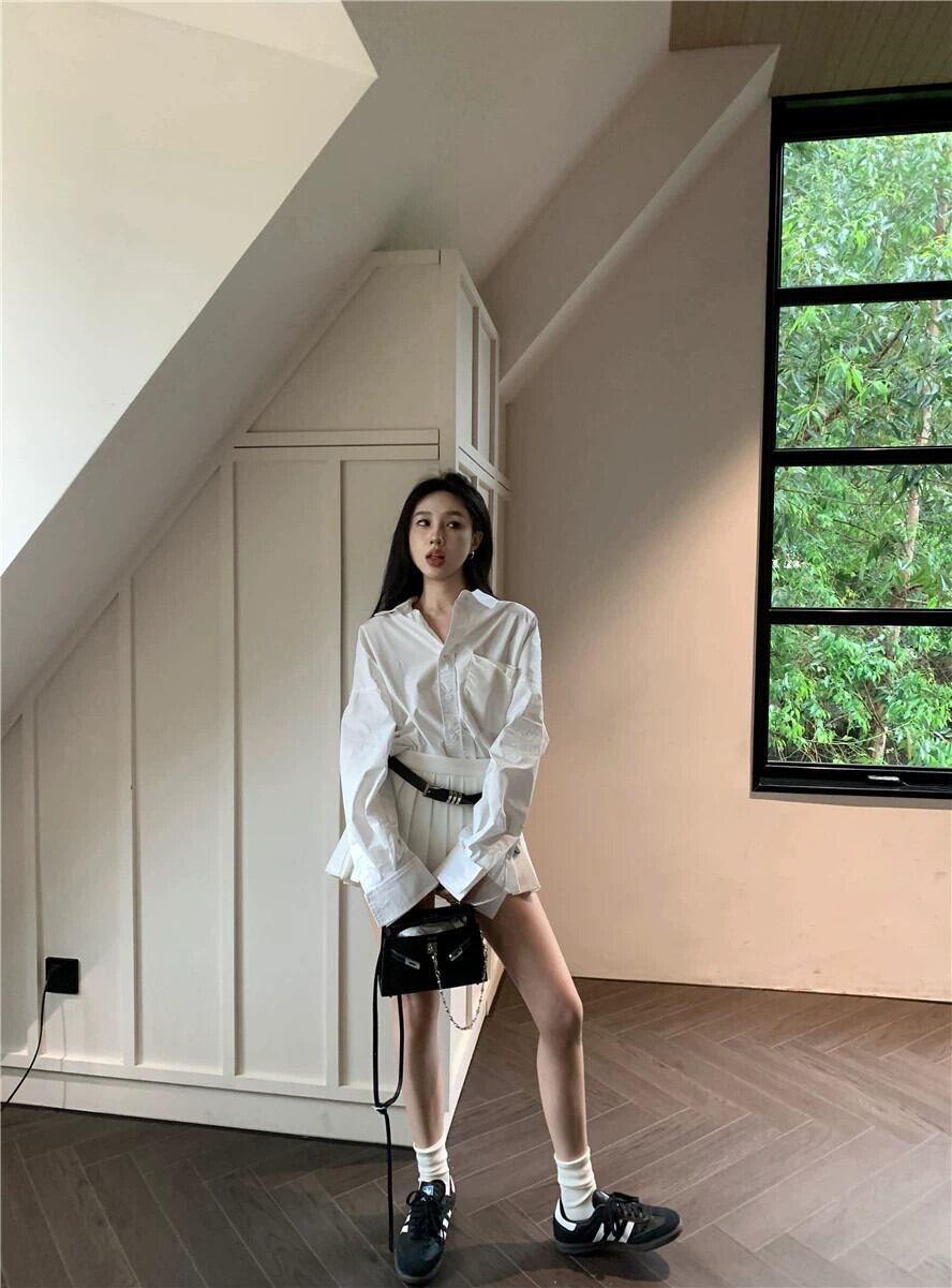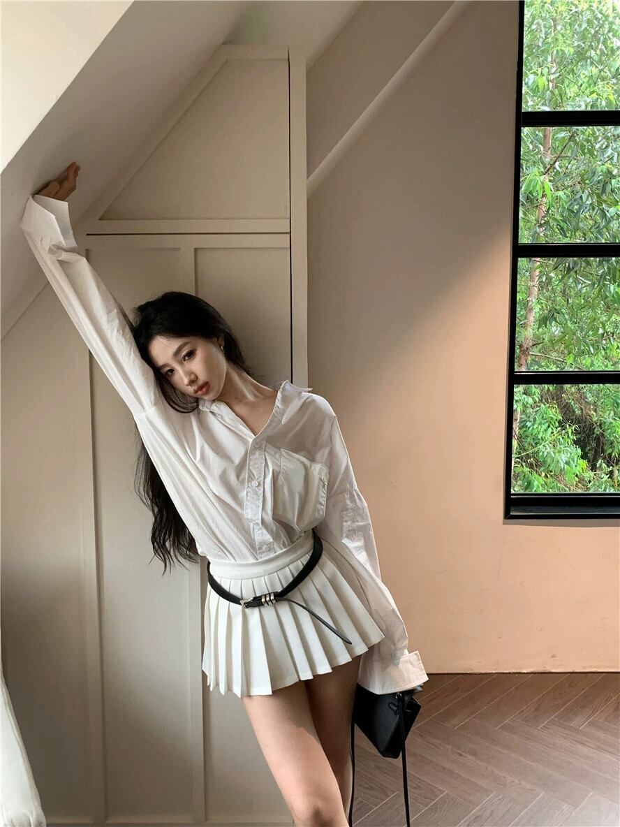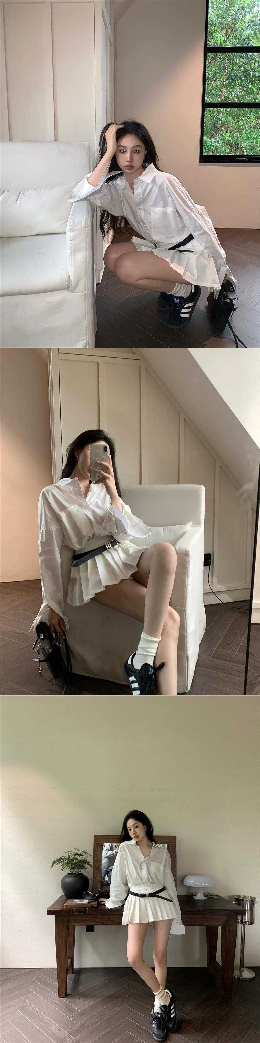 白ポロカラー長袖シャツレディース春スーツ2024新作ハイウエストプリーツスカートAラインスカート2点セット ロング ホワイト スプリング 春物 0921959652523367