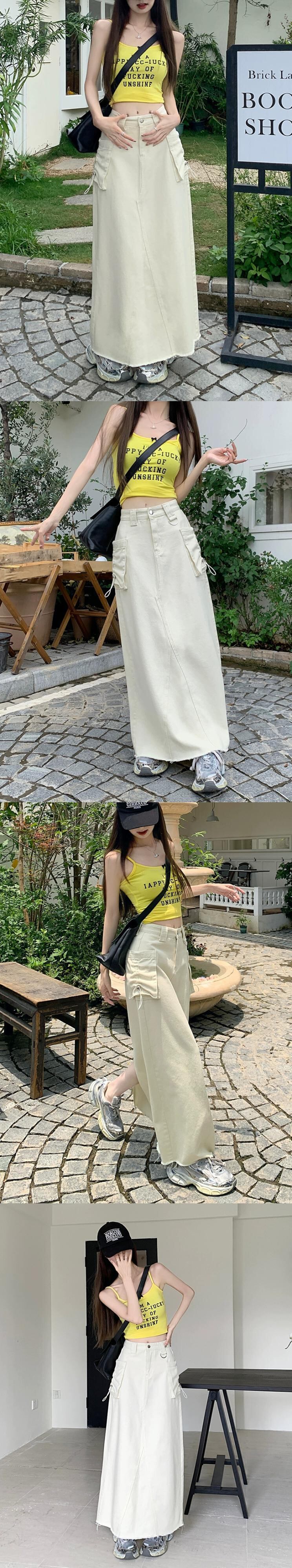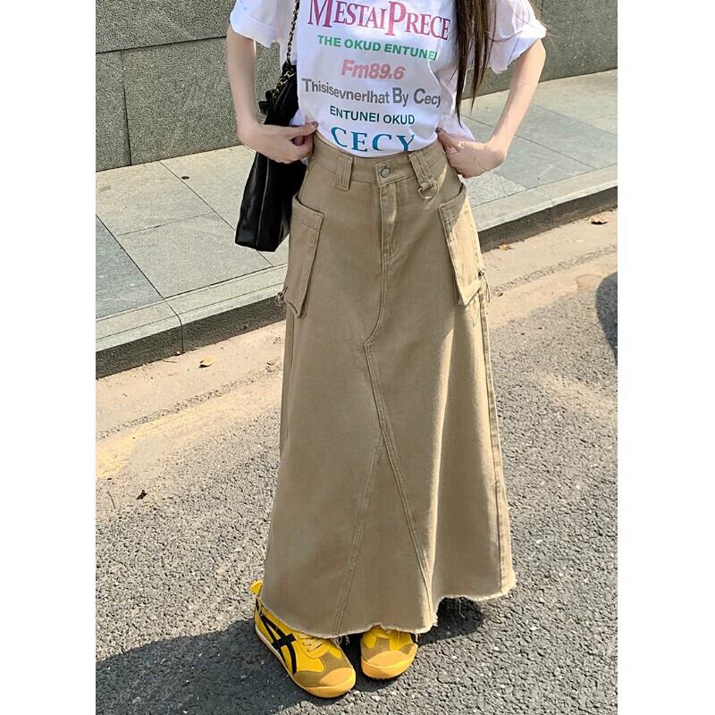 カーゴポケットローエッジデニムスカート レディース 2024春 万能ウエストスリット Aラインスカート ロングスカート スプリング 春物 0921931383716554
